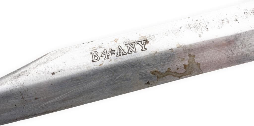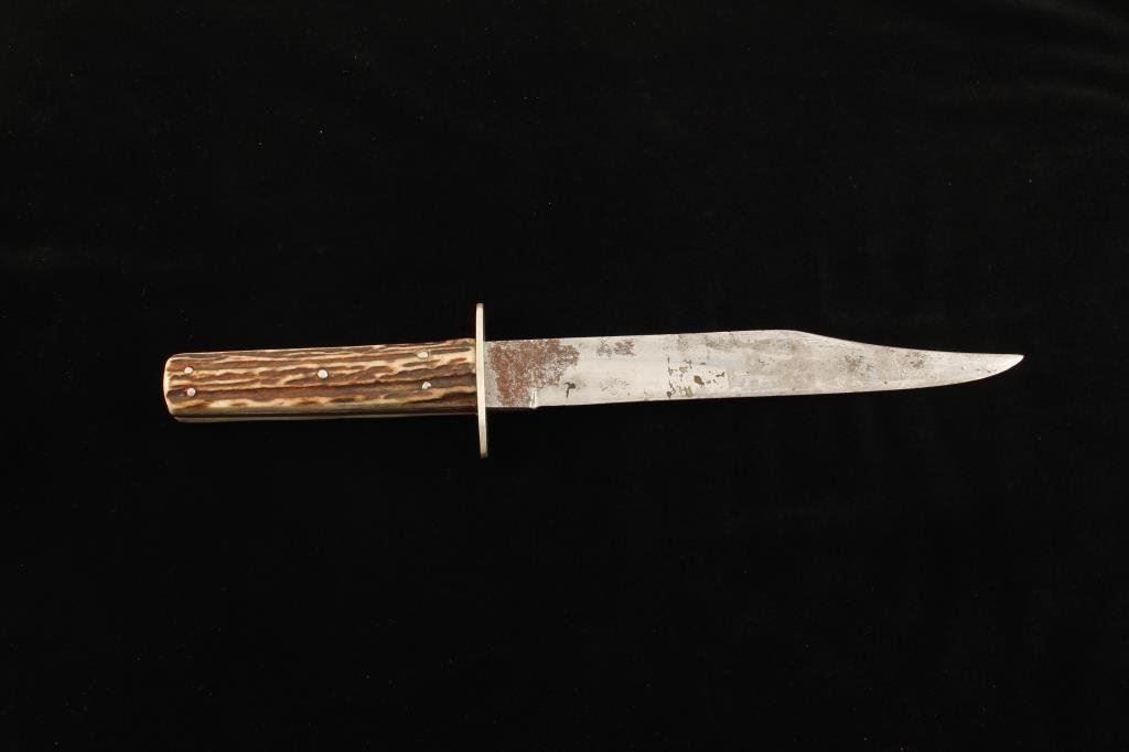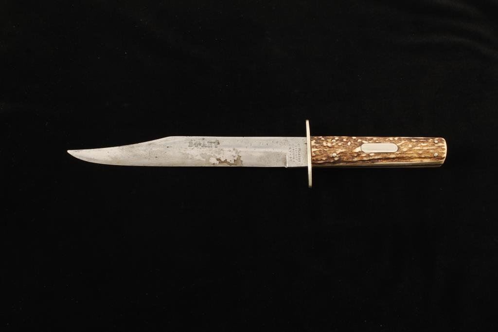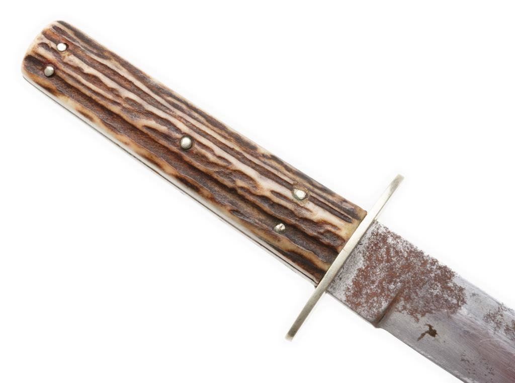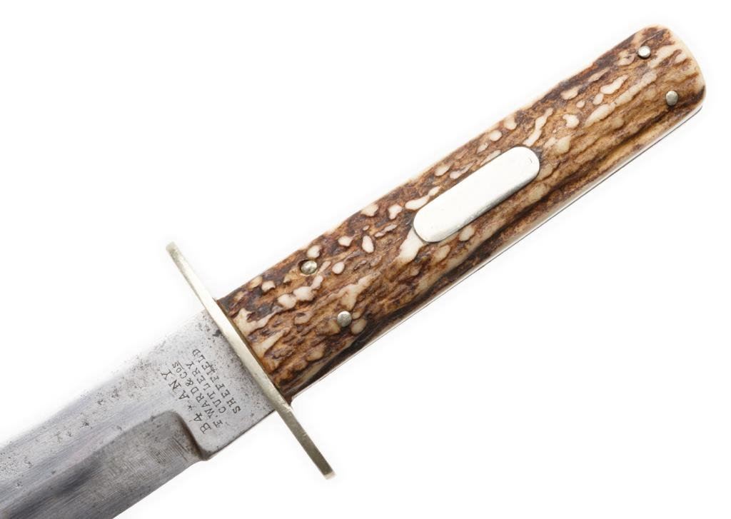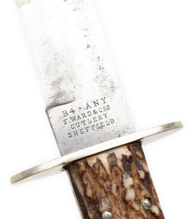 Clip point Bowie knife with stag grip and simple cross guard, approximately 12” overall with a 7.5” blade marked “B4 * ANY/F. WARD & Cos CUTLERY/SHEFFIELD” with larger desirable logo “B4 * ANY” also marked at mid-point of blade’s left side; overall good to very good condition displaying scattered spots of erosion and an area of surface rust and light pitting at the base of the right side of the blade. Est.: $350-$700.