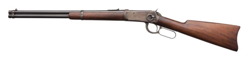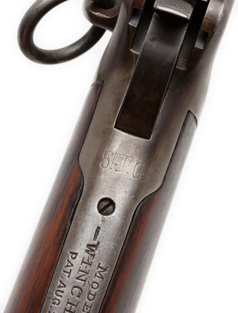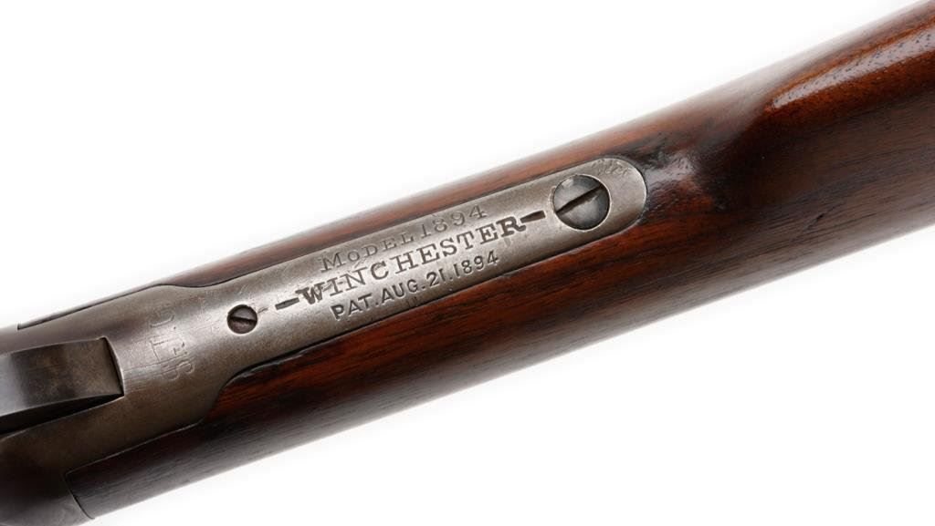 Antique Winchester Model 1894 lever action SRC, .30 W.C.F. caliber, 20” barrel, S/N 35484, blued finish, wood stocks. This Winchester is in overall good to very good condition displaying the majority of an old re-blued finish to the barrel and loading tube. The receiver shows a brown patina with inscribed initials “SJG” on the top tang behind the hammer. The action is crisp, the markings good and the bore overall good. The wood stocks are good to very good. Est.: $700-$1,400.