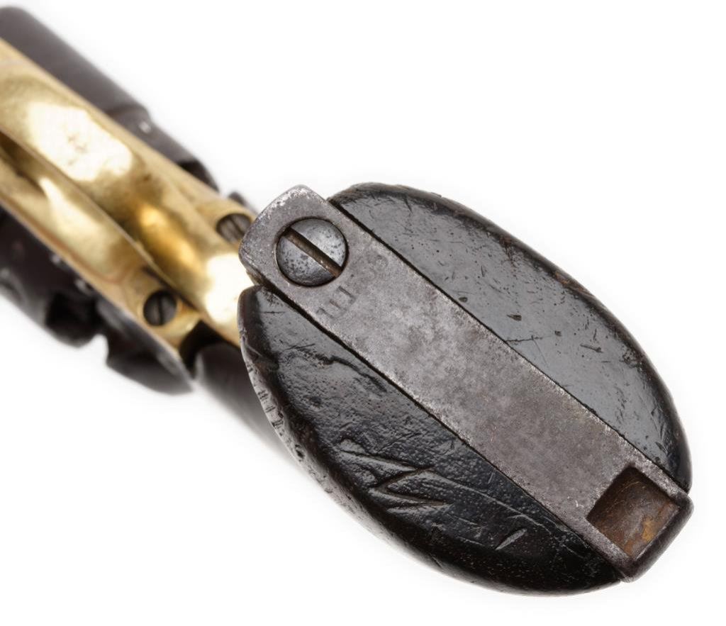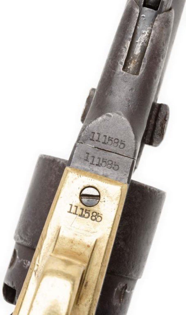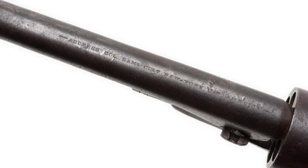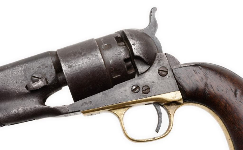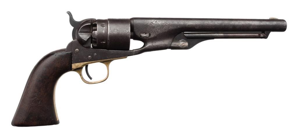 Colt Model 1860 Army percussion revolver, .44 caliber, 8” barrel, blued and case hardened finish, wood grips. This gun is in overall good + condition displaying a dark patina to metal surfaces with scattered old mars and some areas of erosion and pitting; matching visible numbers, good action and markings; grips are worn with scattered old mars and dings from carry and storage but overall good; no visible inspector cartouches. Est.: $800-$1,600.