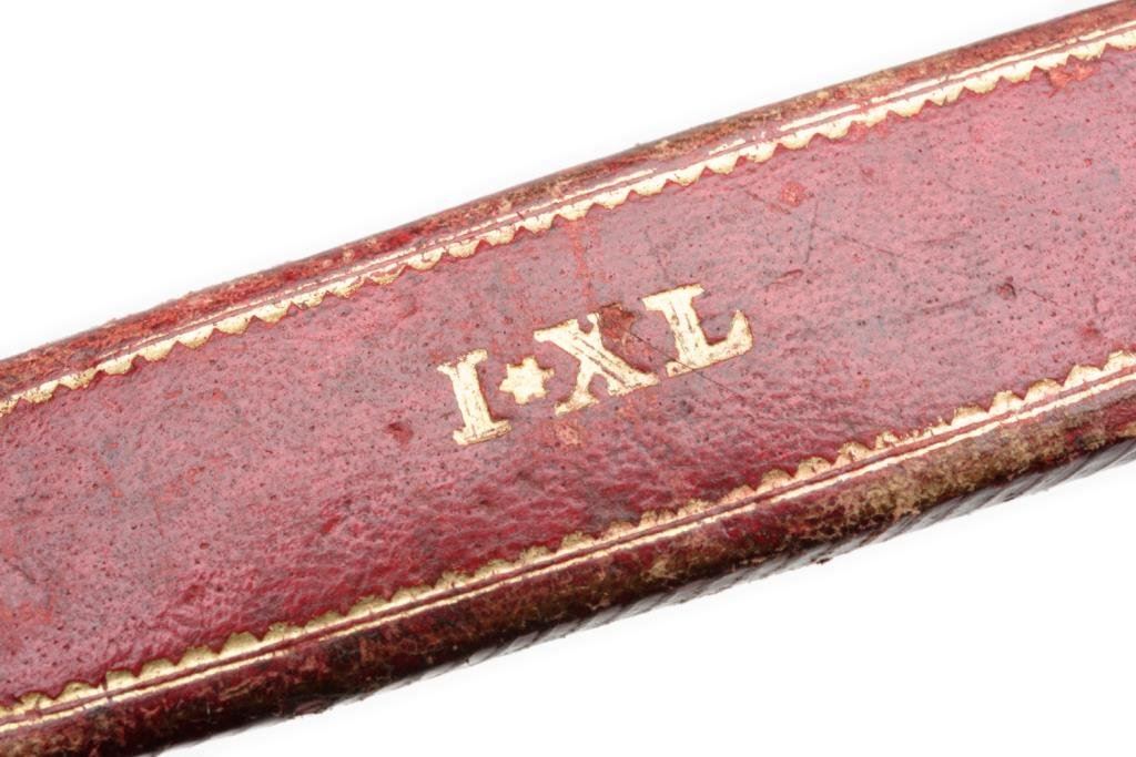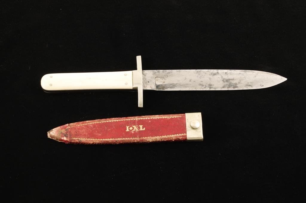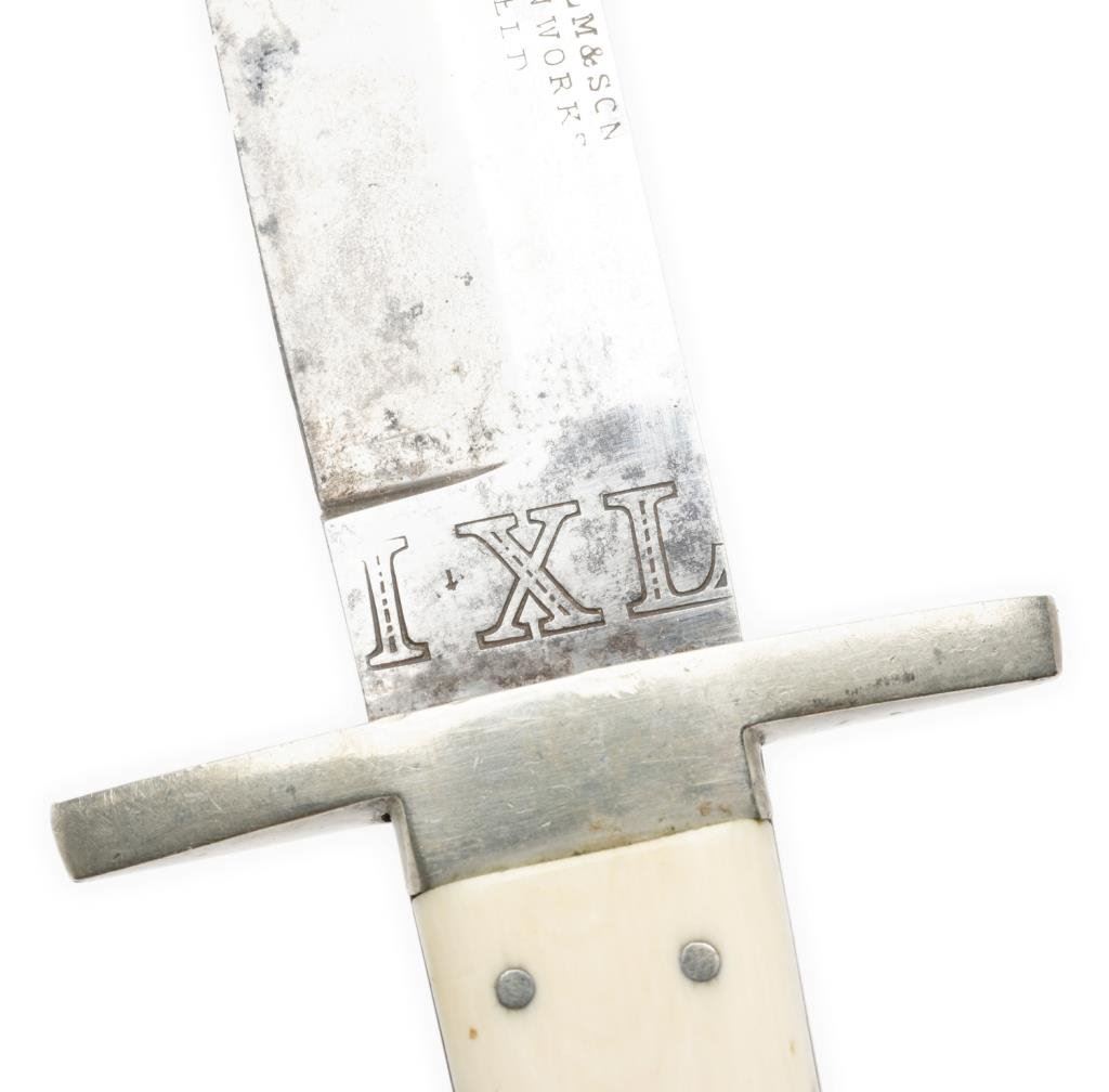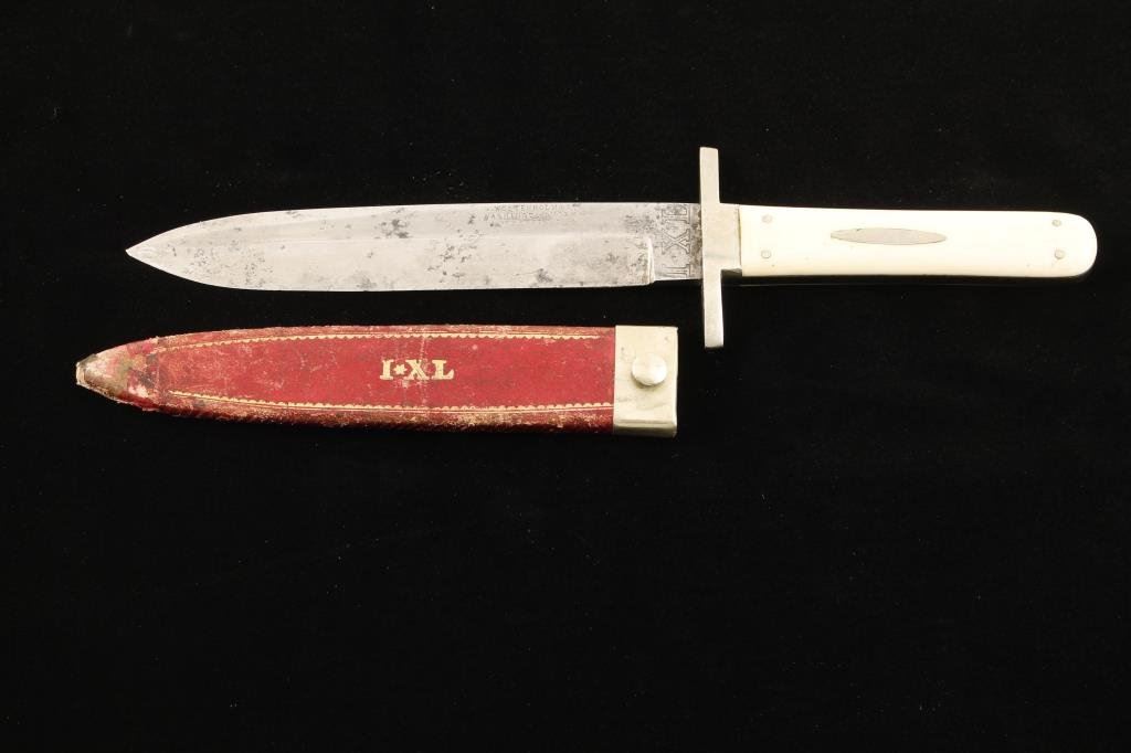Exceptional George Wostenholm and Son, Washington Works, Sheffield-marked IXL pear point Bowie knife with fancy grip and original I*XL-marked scabbard (ca 1850’s to 1860’s. The knife is approximately 10.25” overall with a 6” blade in overall very good + condition showing considerable original polish on the blade; some scattered spots of erosion; scabbard is good + with original metal throat but missing metal tip. Est.: $700-$1,400.