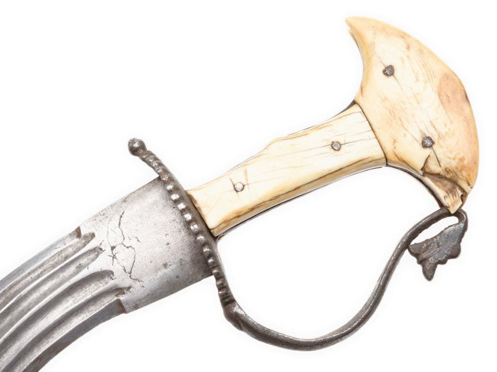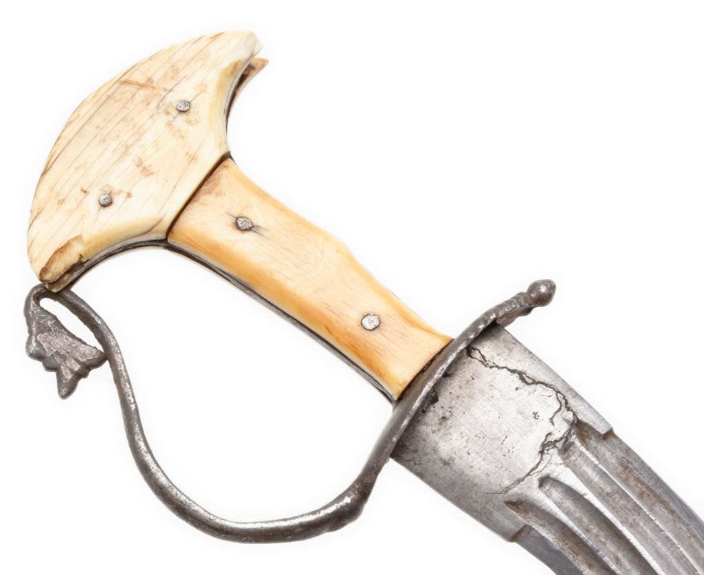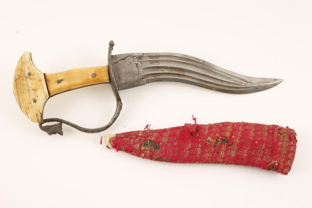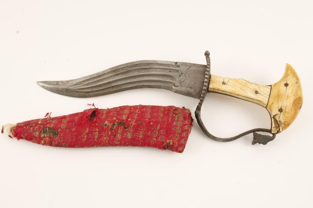 Mid-East to India curved dagger with bone grip and pommel plus iron guard, approximately 12.5” overall with an 8” blade showing a couple old forging flaws at the ricasso; accompanied by a material-covered wood sheath. The knife is in overall fair to good condition displaying wear and use; the sheath is fair + with some wear losses. Est.: $200-$400.