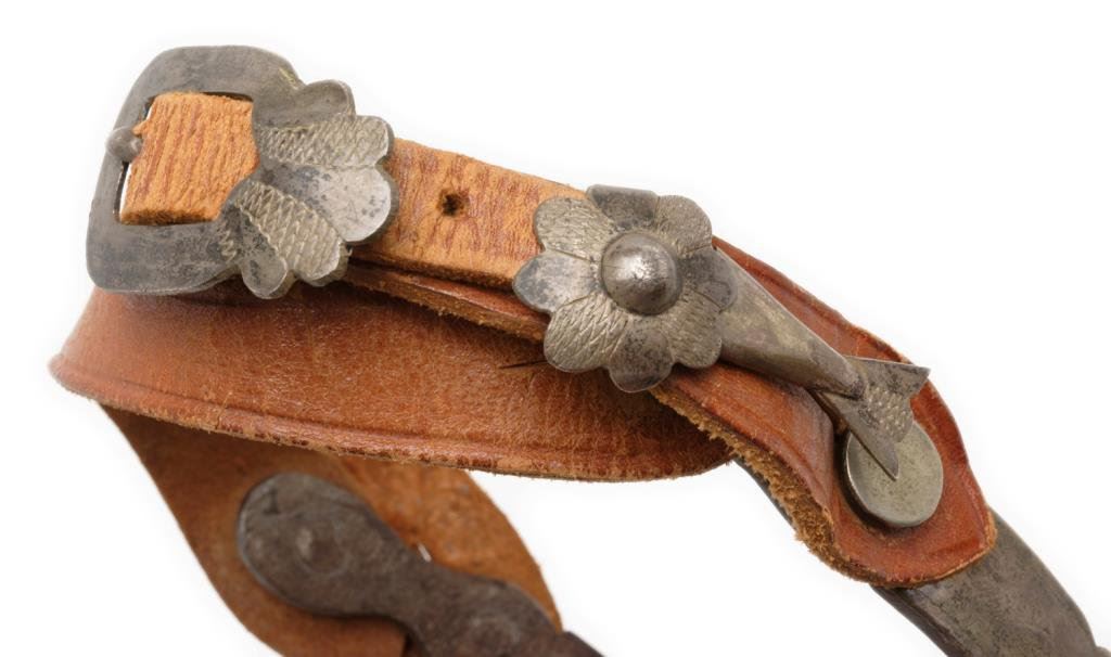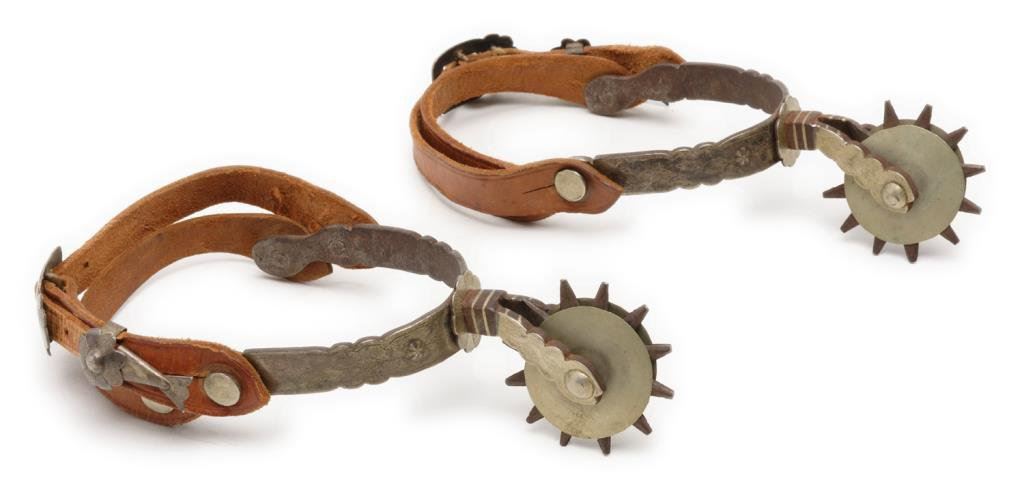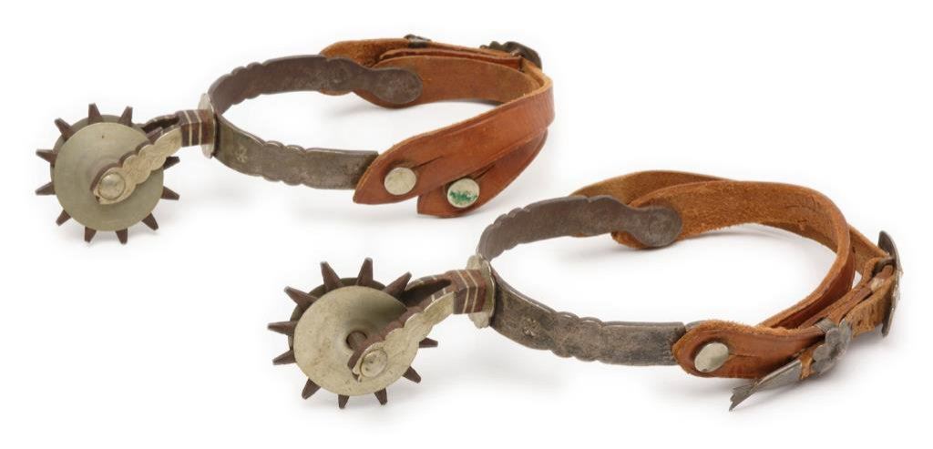 Pair of engraved silver overlay spurs with 2-1/4” 12 point rowels and “jingle” plain conchas on each side of both rowels; no visible maker marks; plain leather straps. Est.: $300-$600.