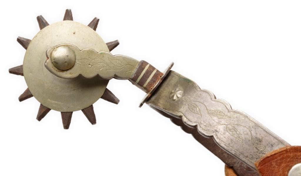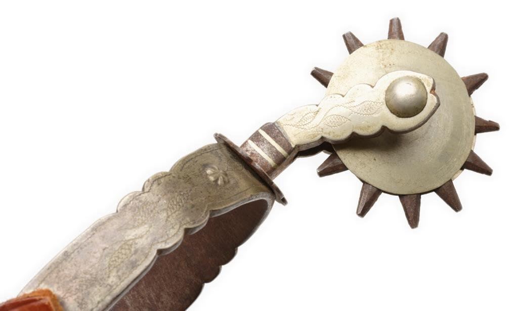 Lot 341 Pair of engraved silver overlay spurs with 2-1/4” 12 point rowels and “jin