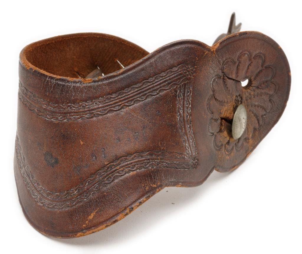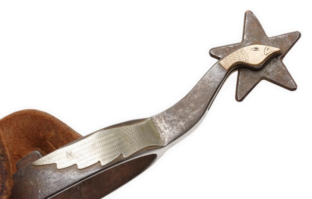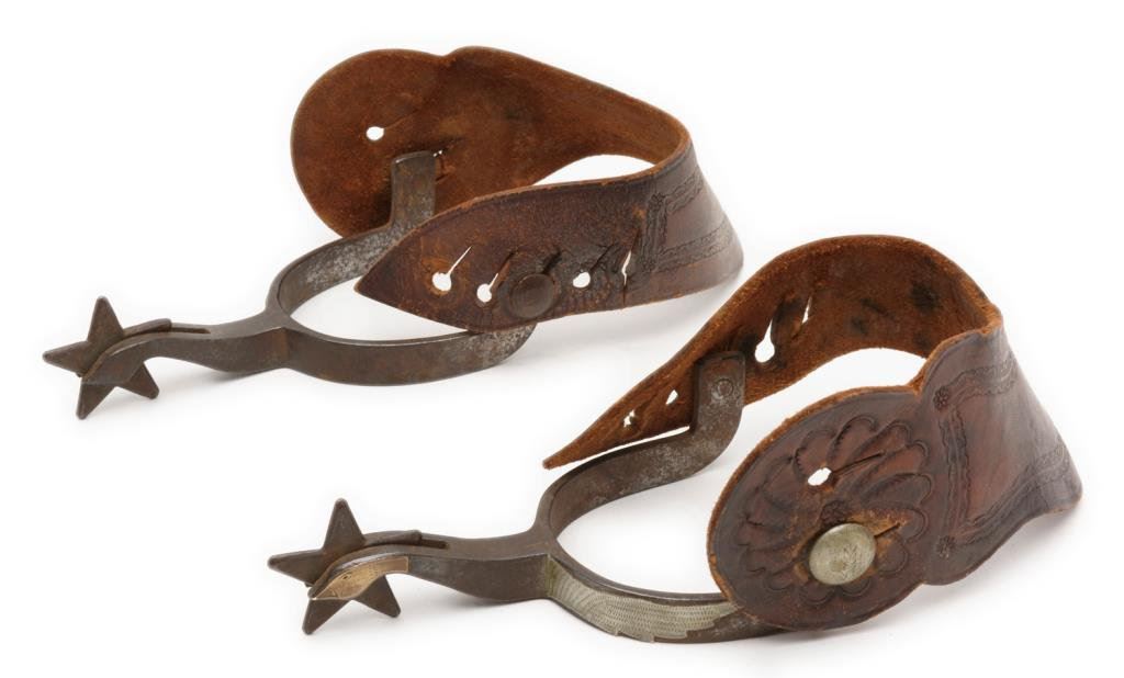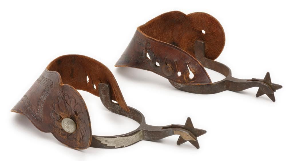 Pair of unmarked spurs with engraved silver overlays to resemble a goose in flight; 1-3/4” 5 point rowels, engraved strap retaining discs, wide tooled leather adjustable straps. Est.: $350-$700.