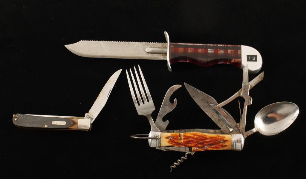 Lot of 3 collector knives including a 7 feature utility pocket folder with stag slabs and metal belt ring; features include a knife marked “SAKURAI”, a shorter knife blade, a fork, a spoon, scissors, a can opener and a sawblade; also a Schrade “Old Timer” two blade pocket knife with pick and tweezers; finally a very interesting European “in-theater” WW II made saw back knife with alternating red and clear stack grip, approximately 10.75” overall with a 5.75” blade. Est.: $175-$350.