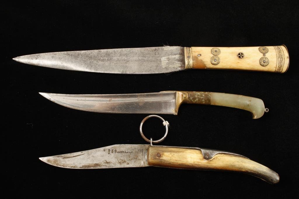 Lot of 3 collector knives including an 18th or 19th Century folding knife with horn scales, approximately 9” overall with a 4” blade marked “239 OARNAJUOT” (?; spelling difficult to read) with metal back cover and pull ring to release blade to re-fold; also a small dagger with jade handle, approximately 9” overall with a 5” blade; good overall and a 19th Century Turkish or mid-eastern handmade knife with bone slabs on grip and brass decoration, approximately 10.75” overall with a 6.5” blade and also overall good condition. Est.: $275-$550.