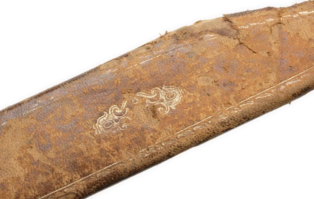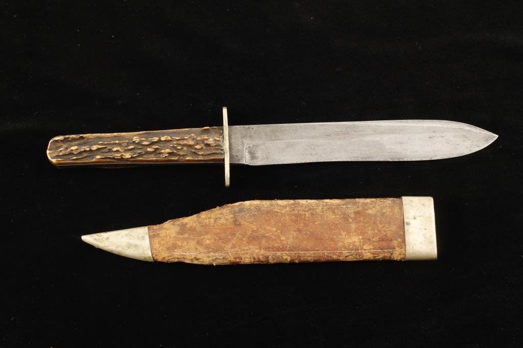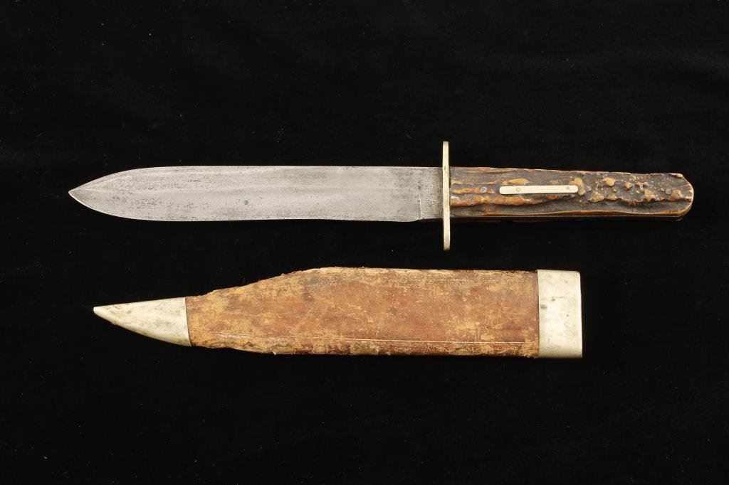 Bridgeport Gun and Implement Co.-marked spear point Bowie knife with stag grip, approximately 11” overall with a 6.5” blade and period scabbard; knife is in overall good to very good condition with grey patina; simple brass cross guard; scabbard is for a clip point Bowie but fits this spear point; metal tip and matching throat are present, some scuffing to leather cover and approximate 2” split to seam at front top of scabbard. Est.: $500-$1,000.