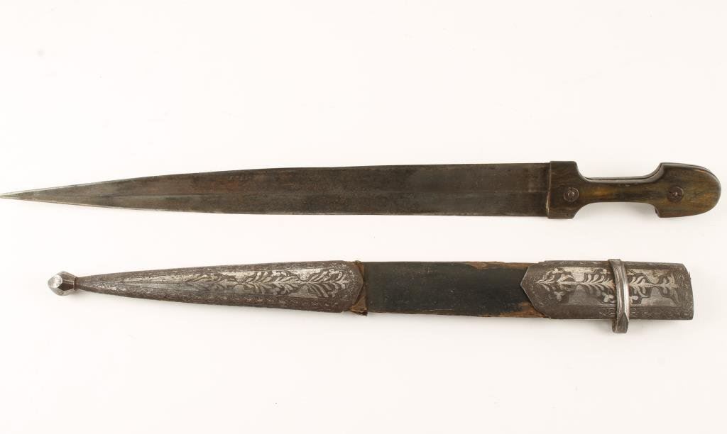 Russian Kenjal with silver and gold inlay; maker’s marked; approximately 20” overall with a 15” blade; accompanied by wooden sheath with finely decorated metal throat and tip. Est.: $600-$1,200.