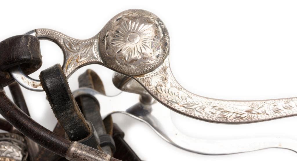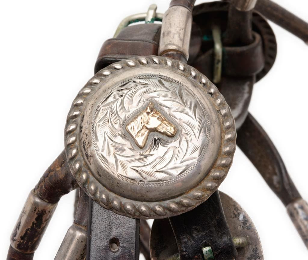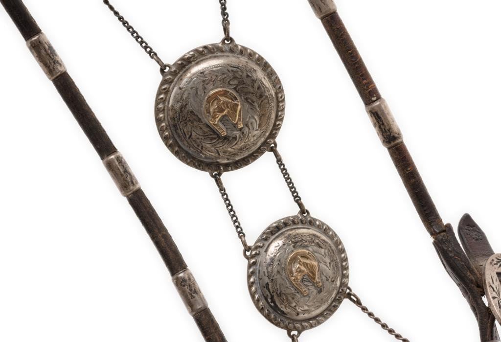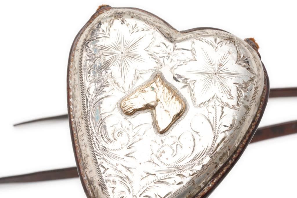 Crockett engraved silver overlay bit, marked “CROCKETT” and “STAINLESS” on the bit; accompanied by a fancy headstall with engraved buckles and hanging engraved sterling conchas with 10K gold horse heads and horse shoes attached plus engraved buckled leather reins. There is also a separate leather piece with iron clasp on one end and a beautiful engraved silver heart shaped large concha with matching gold horse head in the center (top of heart shows leather stubs that had previously attached to another part of the headstall’s leather works. Est.: $750-$1,500.
