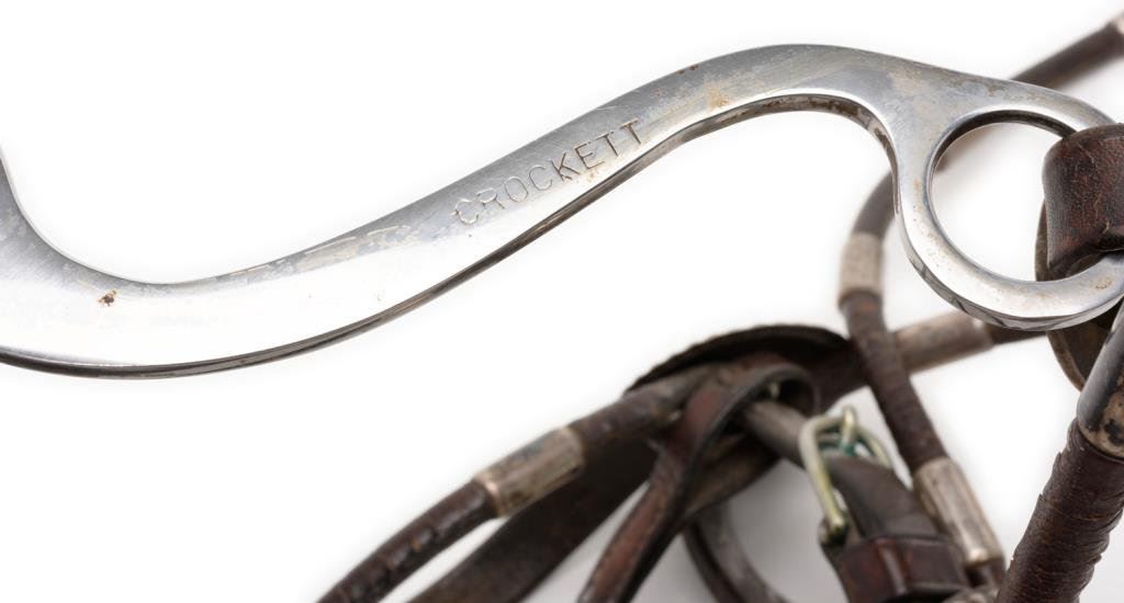 Lot 365 Crockett engraved silver overlay bit, marked “CROCKETT” and “STAINLESS” on