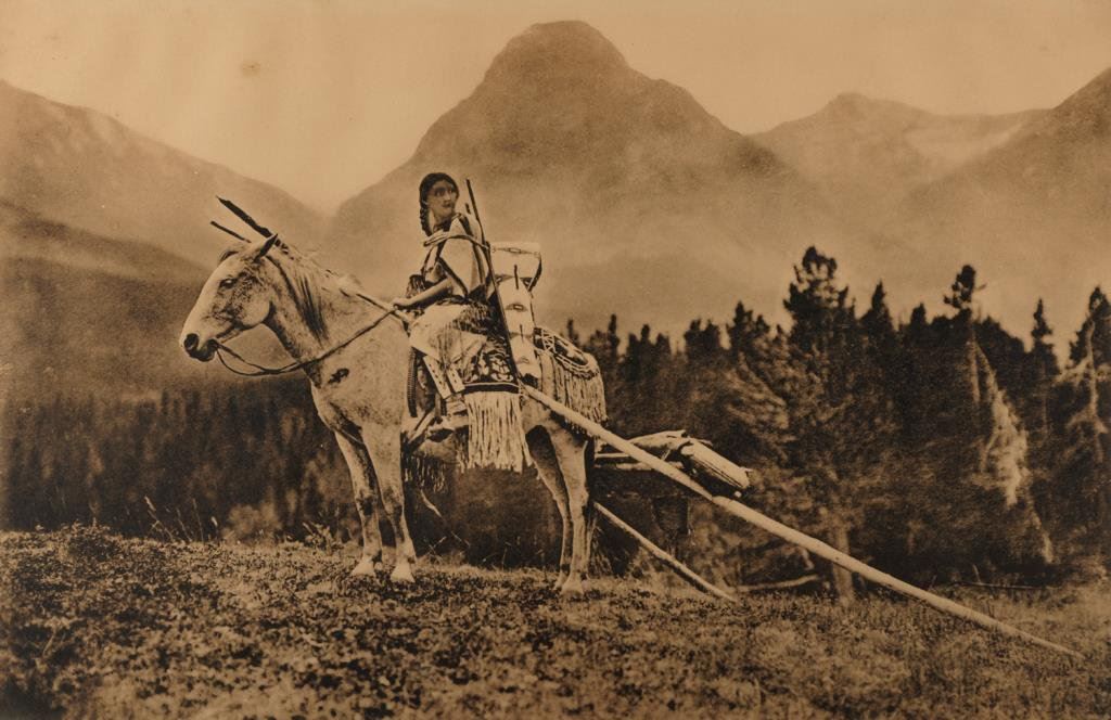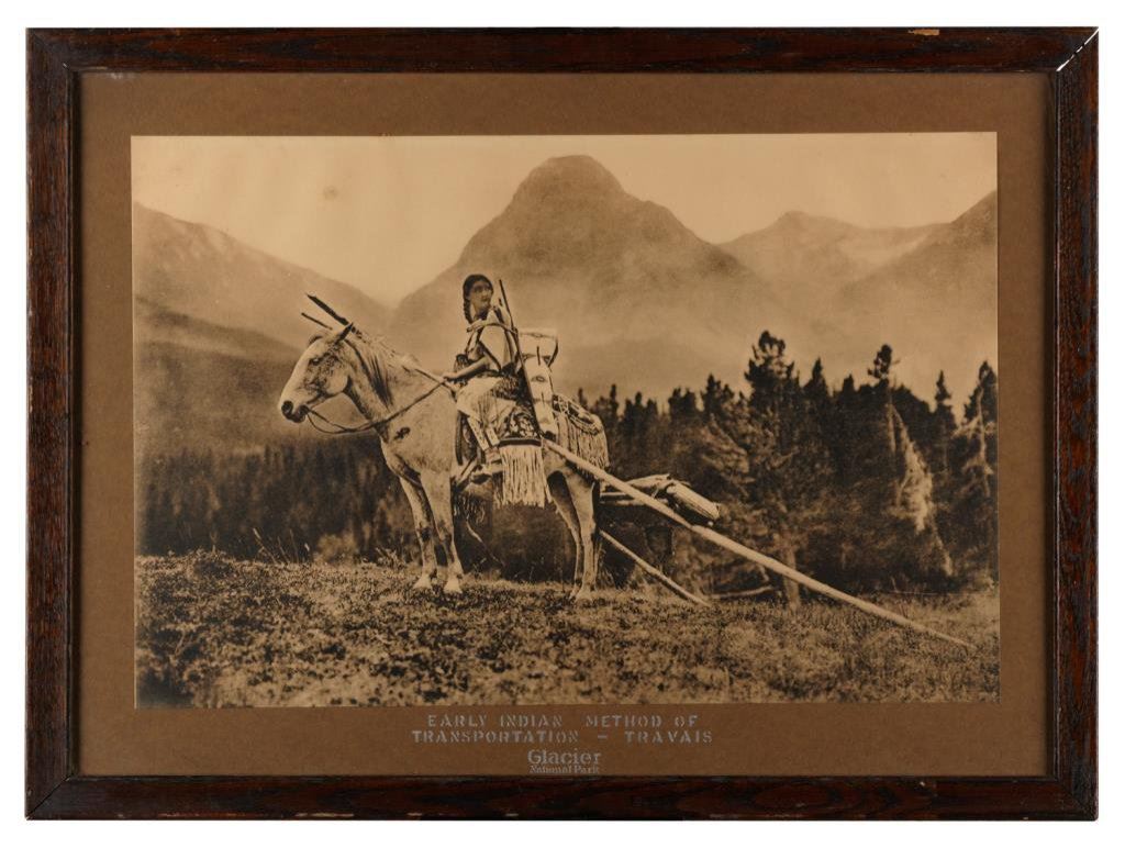 Antique collotype print off negative of Indian maiden on horseback with travois, approximately 18” x 24” overall and marked at bottom of mat “EARLY INDIAN METHOD OF TRANSPORTATION – TRAVAIS/Glacier National Park”; possibly a display piece at a train station or public building; old oak frame. $350-$700.
