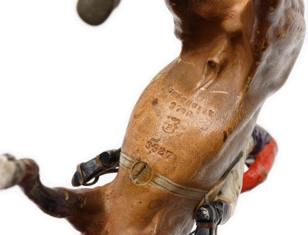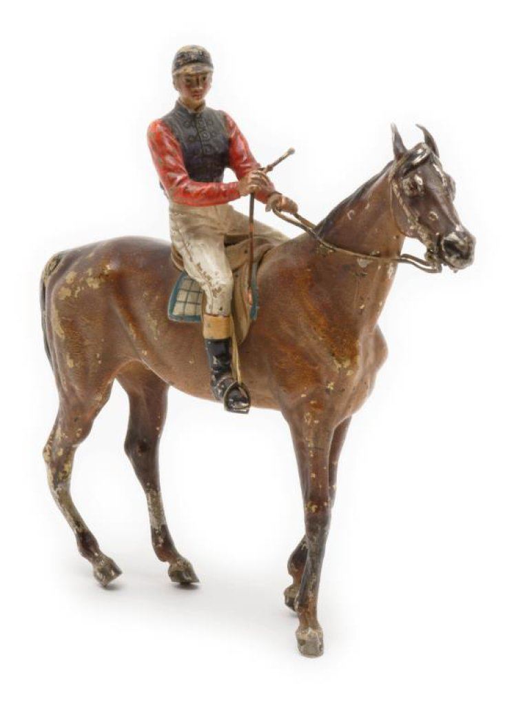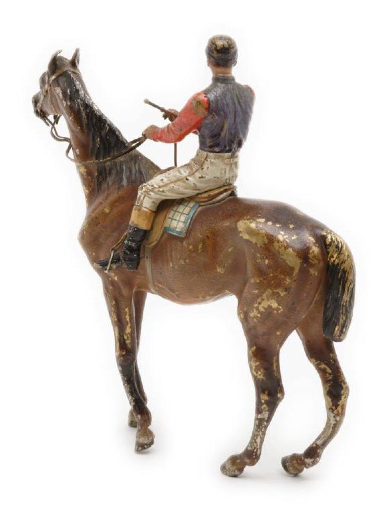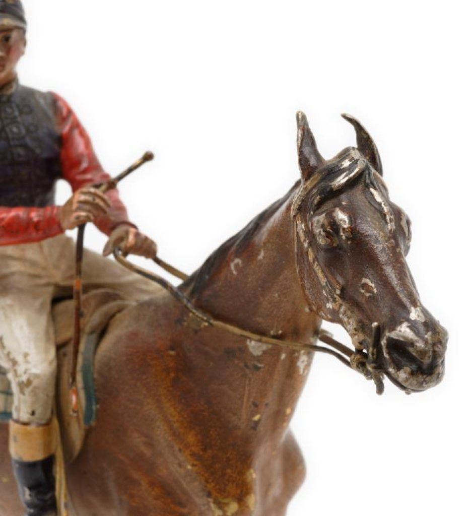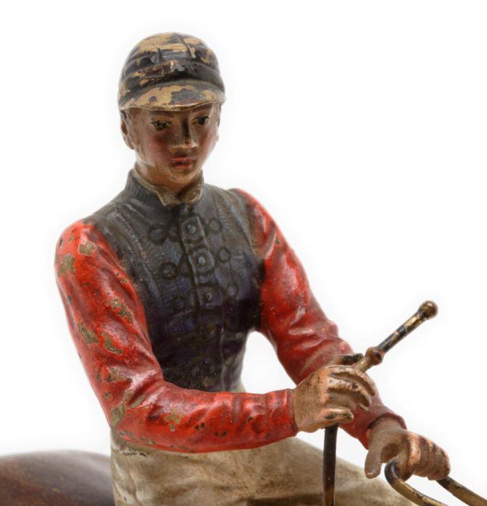 Jockey on horse bronze, approximately 6.5” in height and 7” overall; majority of original paint remaining. Est.: $350-$700.