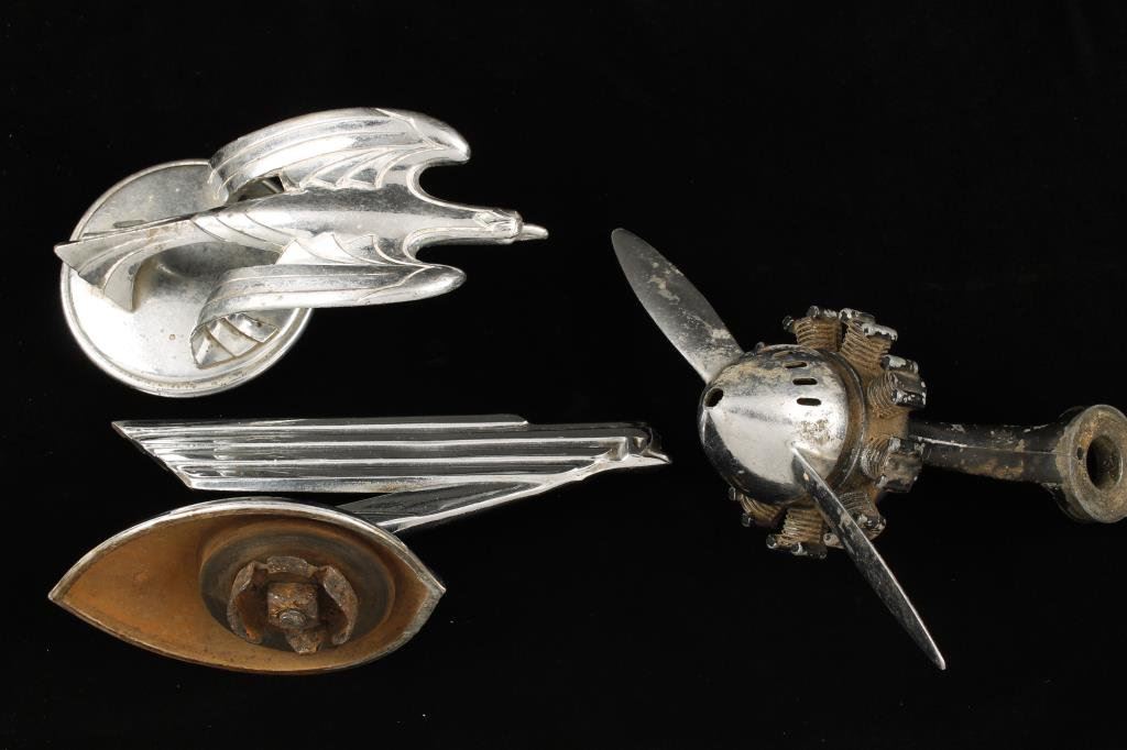 Lot of 3 hood ornaments including a Chevrolet Eagle ornament, ca 1931-32 in very good condition on a large base; an Art Deco Speed Bird, ca 1930’s on large oval base, near excellent condition and a novelty aircraft propeller and engine hood ornament with 9 cylinder radial engine like “Lindy” had; ca 1927-1930’s, fair to good condition. Est.: $350-$700.