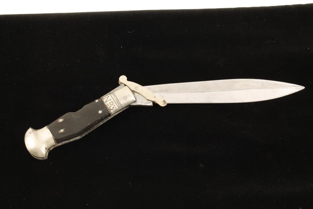 Late 19th/early 20th Century American Bowie knife with clip point and stag grip; approximately 13.5” overall with a 9” blade. Marked with a logo (not legible) and “L.F.& C.” for Landes, Ferry and Clark; overall good condition with simple brass oval cross guard. Est.: $200-$400.