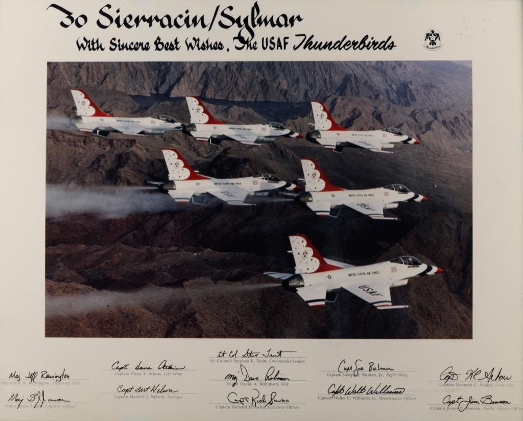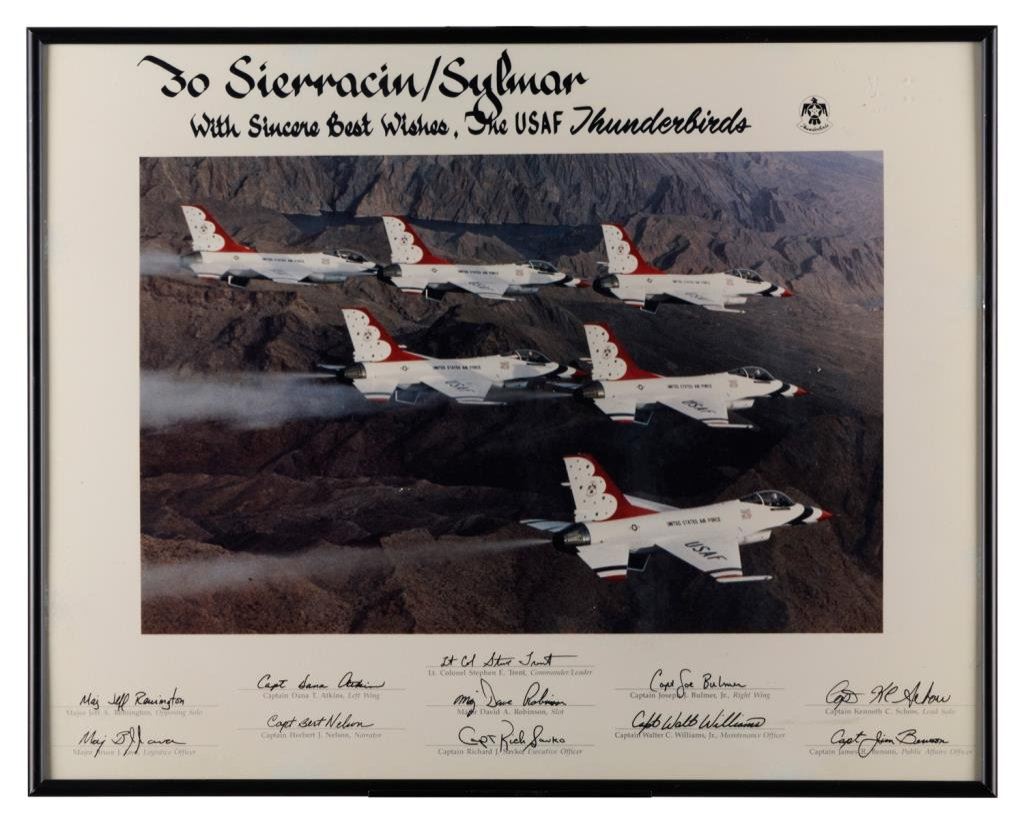 Framed color photo of the U.S. Air Force Thunderbirds flying in formation signed by 11 members of the team! Approximately 16” x 20” overall. Est.: $150-$300.