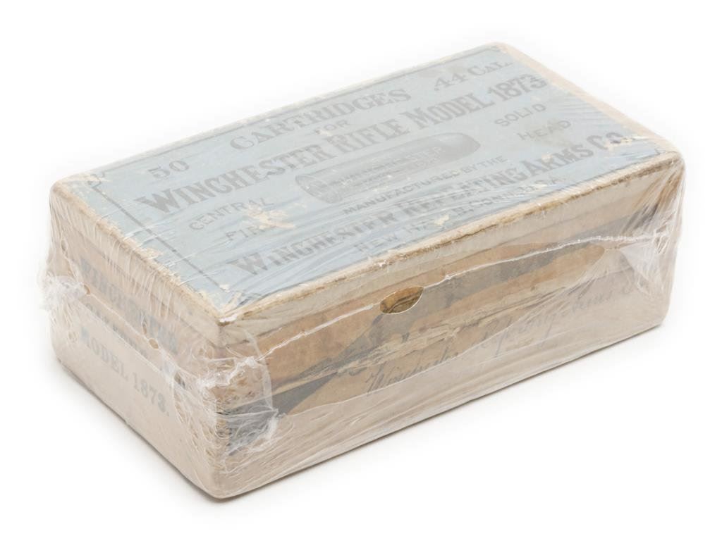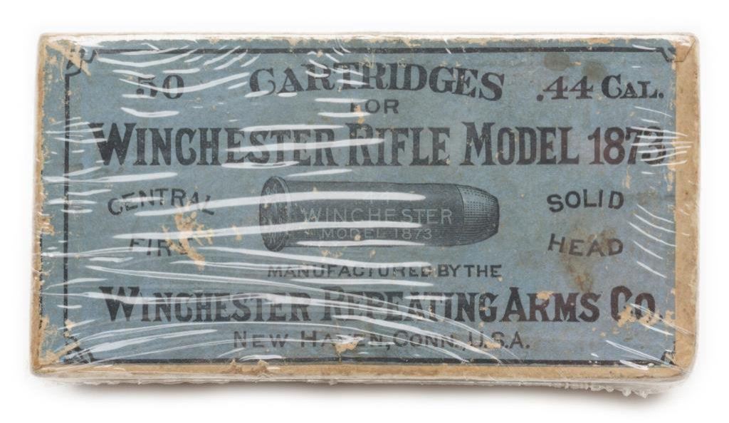 Rare collector’s quality full “picture” box of 50 cartridges for the .44 caliber Model 1873 Winchester rifle. This ammunition was manufactured by the Winchester Repeating Arms Co. and shows the image of the cartridge on the top blue and black label of the box and on one end piece. There is also an image of a Model 1873 Winchester carbine on a side panel of the box. The box is shrink wrapped and is in overall very good to fine condition with some minor scuffs to the blue label. Est.: $400-$800.