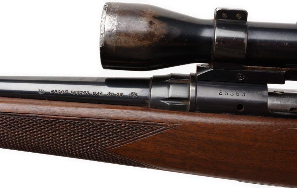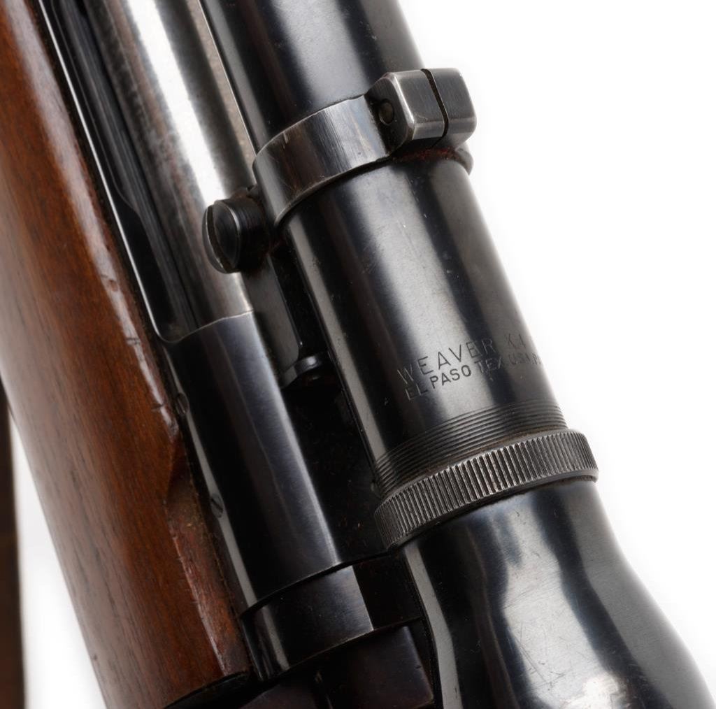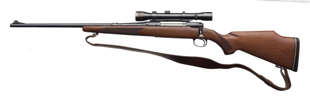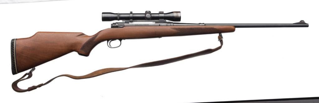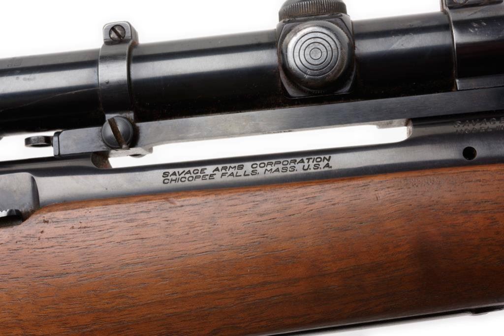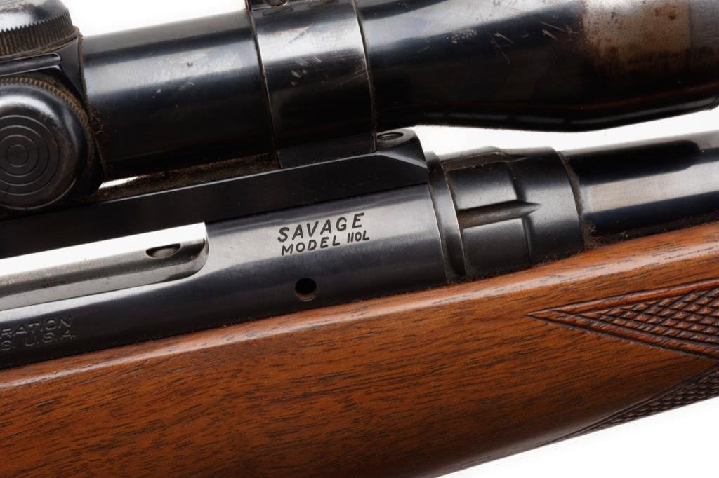 Savage Model 110L left handed bolt action rifle, .30-06 caliber, 22” round barrel, S/N 26363, blued finish, checkered wood stock, leather sling with quick release sling swivels, mounted with a Weaver K-4 scope with fine optics. This rifle is in overall very good to near fine condition with a very good bore, crisp action and markings, fine wood and the majority of its original blue finish. Est.: $300-$600.