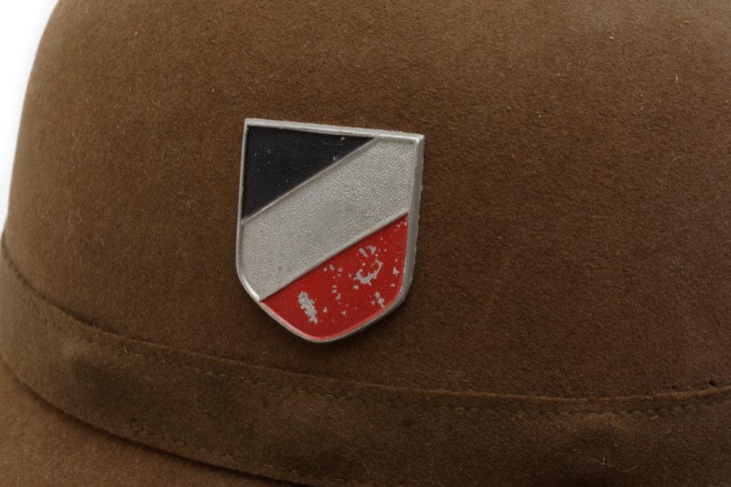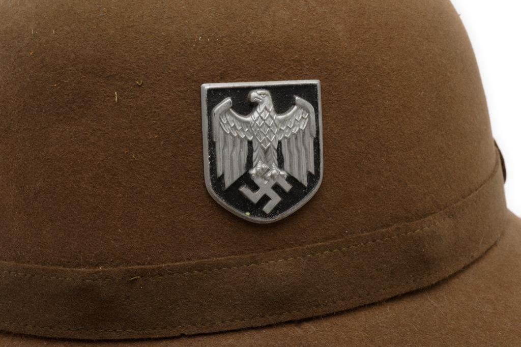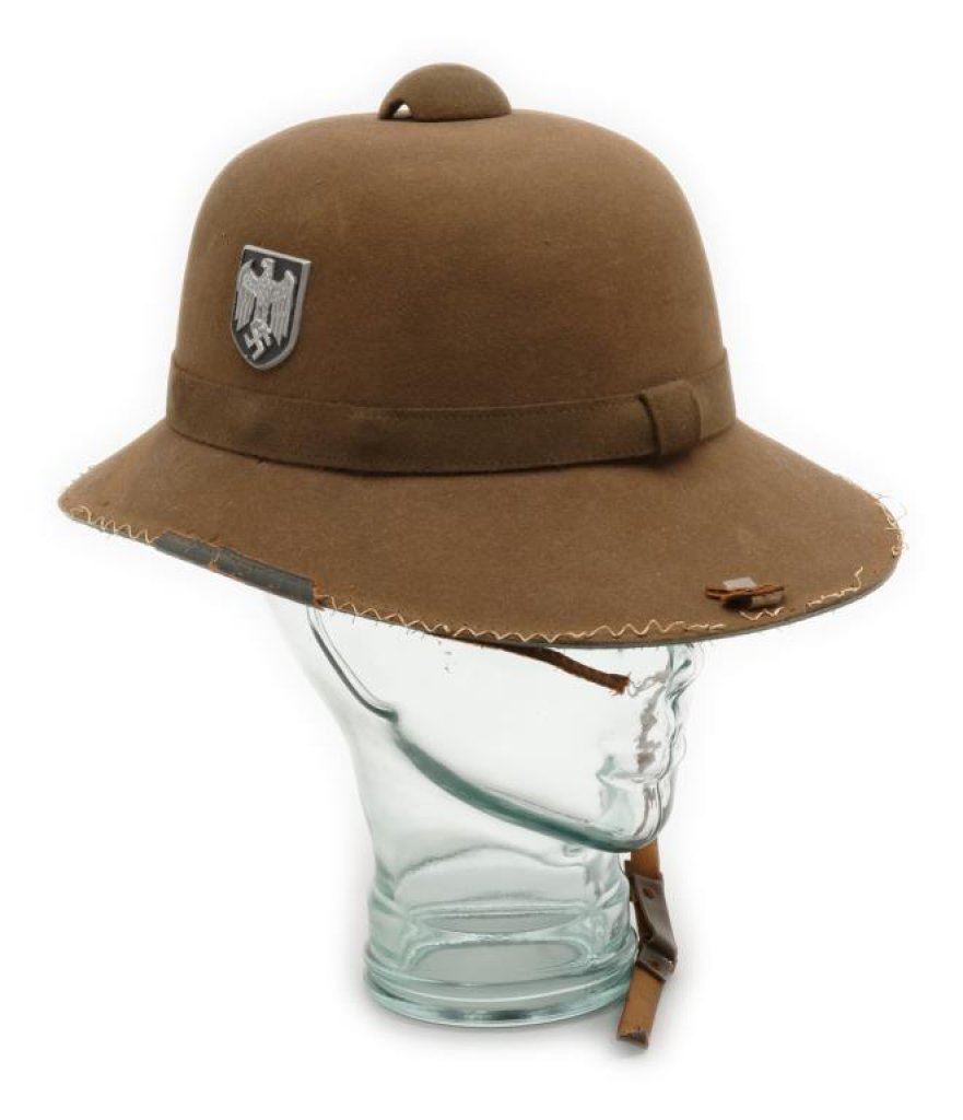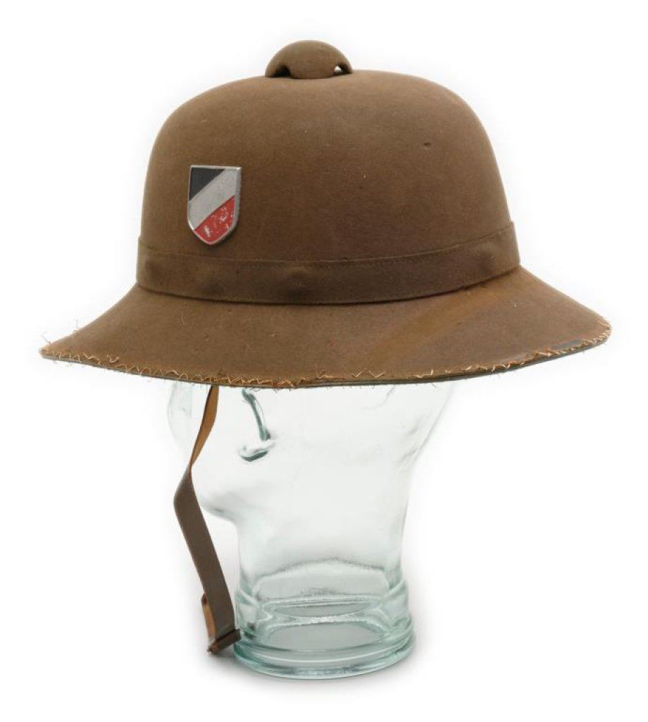 Nazi tropical helmet in need to restoration to the rim’s trim; good emblems. Est.: $300-$600.