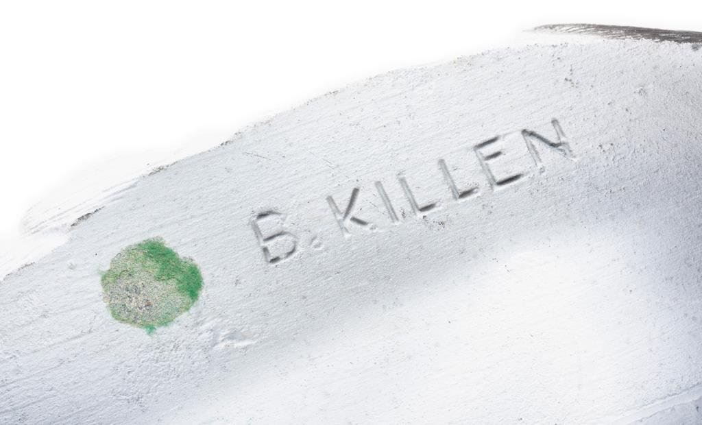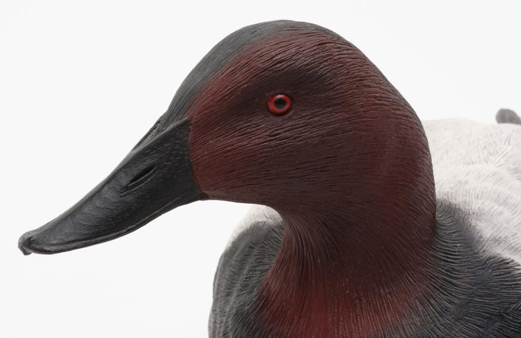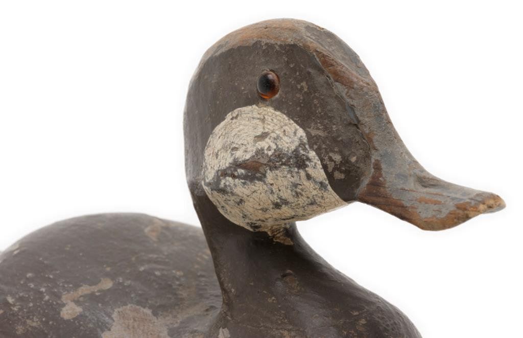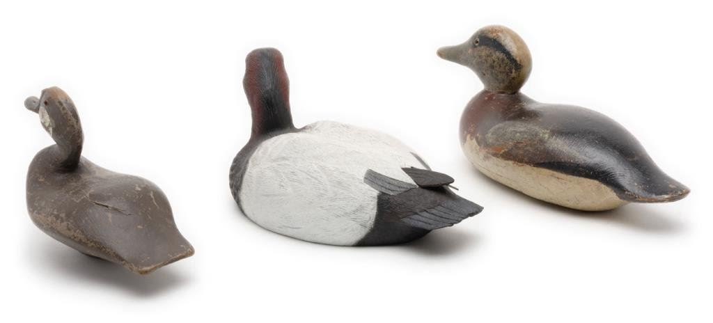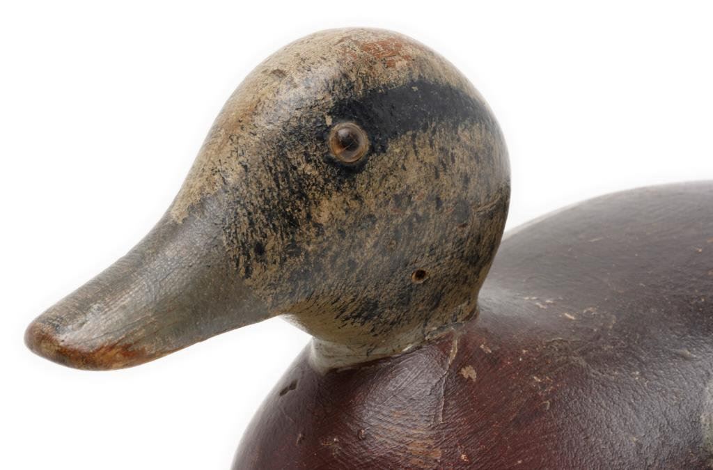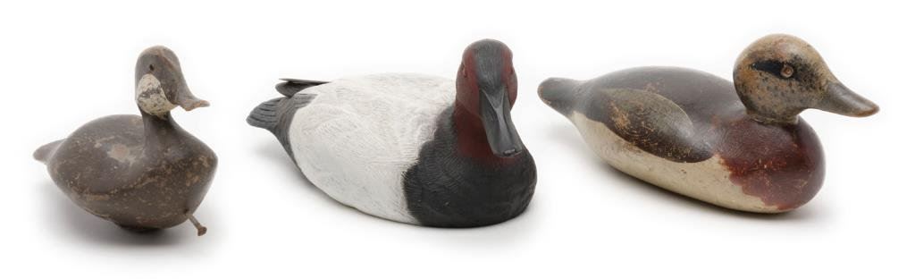 Lot of 3 decoy ducks including an old carved wood duck with glass eyes, approx. 10” x 6” x 7”, brown, white and black original appearing paint, overall fair to good condition; also a multi-color painted wood duck decoy with glass eye (right eye missing), approx. 14” x 6” x 6” and in overall good condition. Lastly, a rubberized black, white and red decoy marked “B. KILLEN” in very good condition and approx. 14” x 7” x 6” in size. Est.: $125-$250.