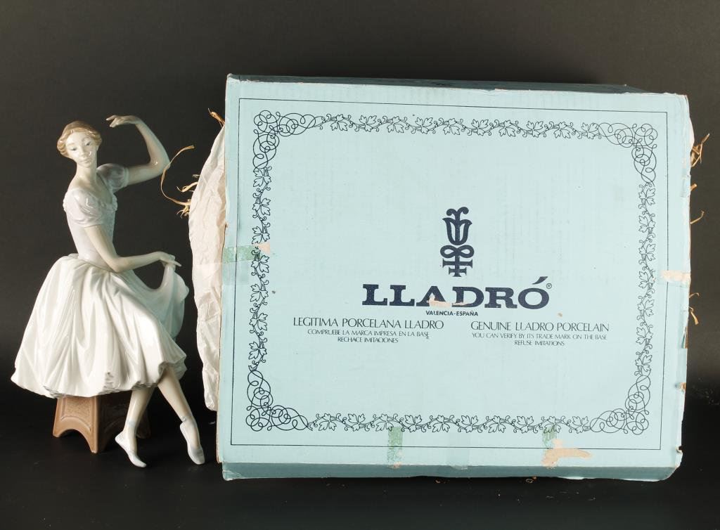 Large Lladro figure of woman dancing, approximately 12” in height, in fine condition at time of description, entitled “Ballet Frivolo”; with factory cardboard box. Est.: $150-$300.