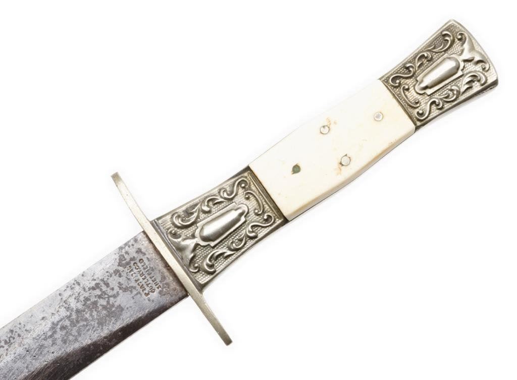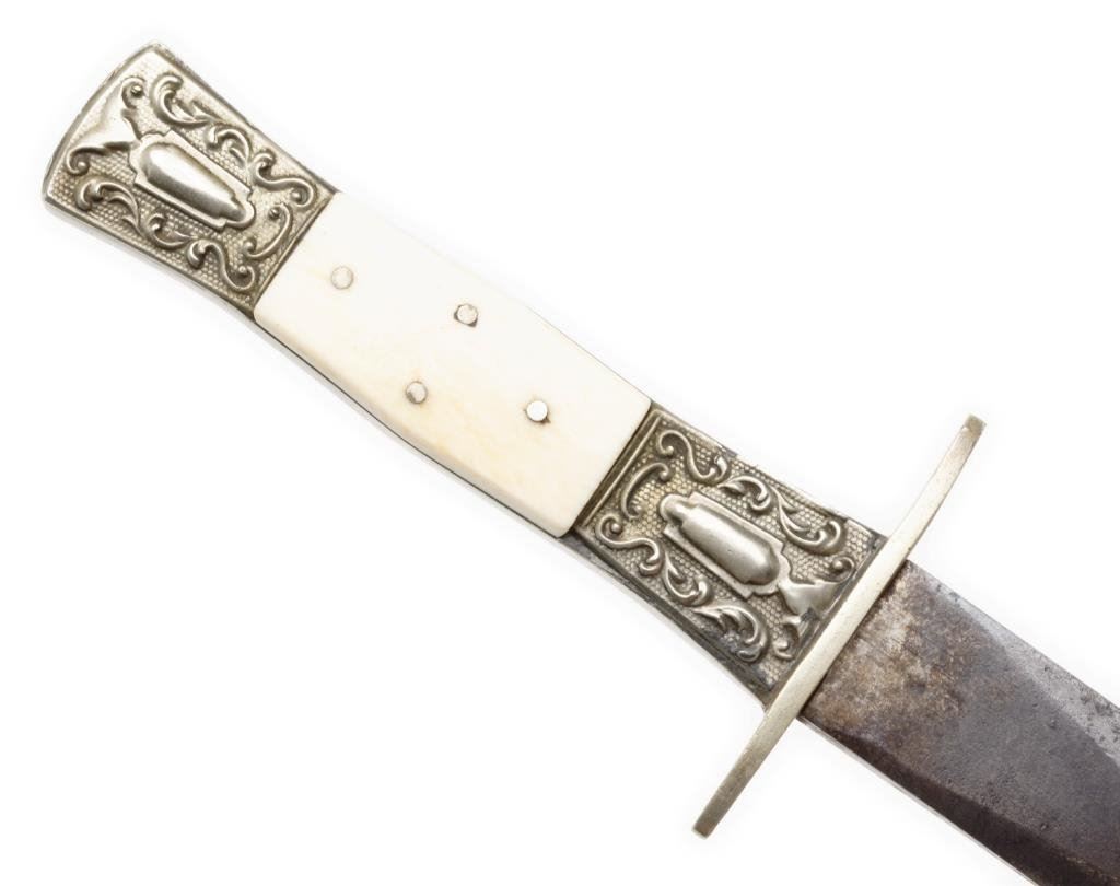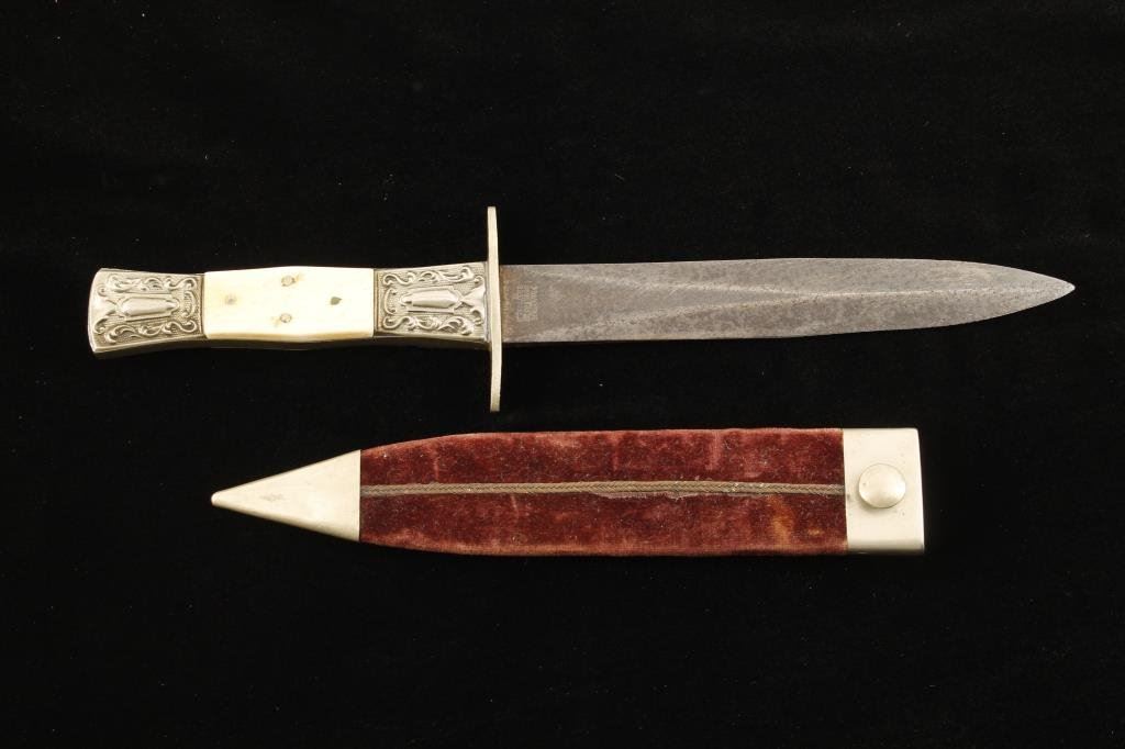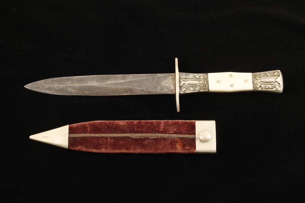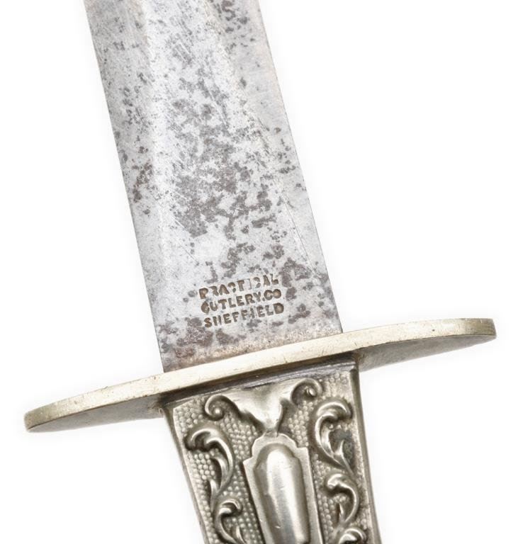 Spear point dirk with fancy mounts and grip, approximately 9.5” overall with a 5.75” blade marked “PRACTICAL CUTLERY CO./SHEFFIELD”; very nice with original scabbard. Est.: $350-$700.