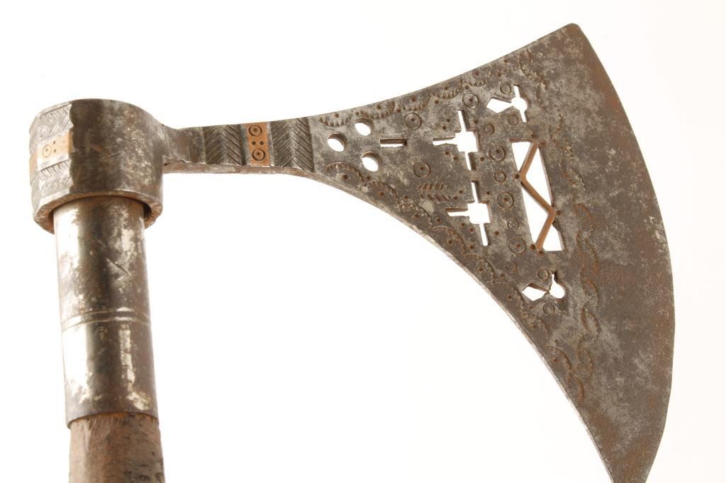 Bonanza collector’s lot including 4 forged axe heads, ca 17th to 19th Century; later iron axe head with wood shaft, approximately 18” overall; tomahawk with leather wrap, approximately 16.5” overall; an Indo-Persian axe with chiseled blade and design with wood shaft, approximately 16” overall and an old iron axe with hidden spear point dagger, approximately 23” overall. Est.: $300-$600.