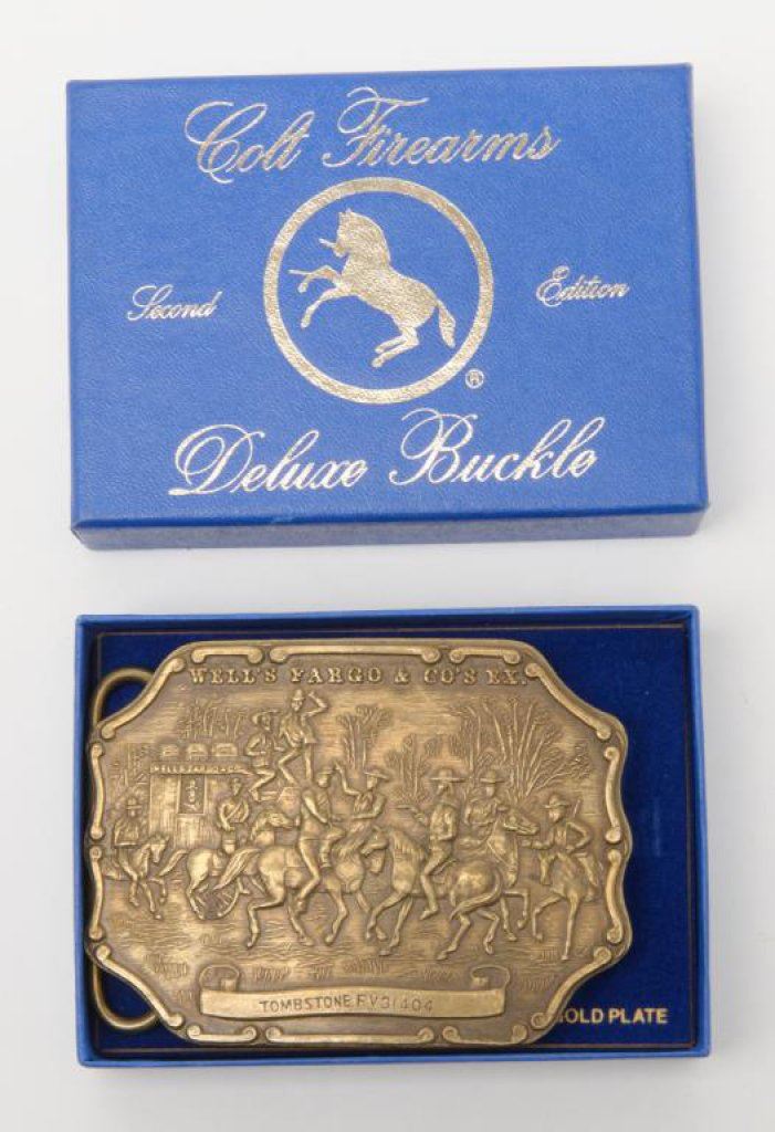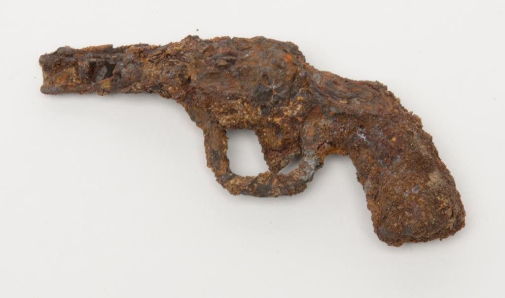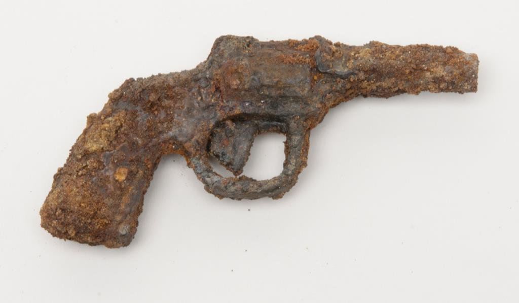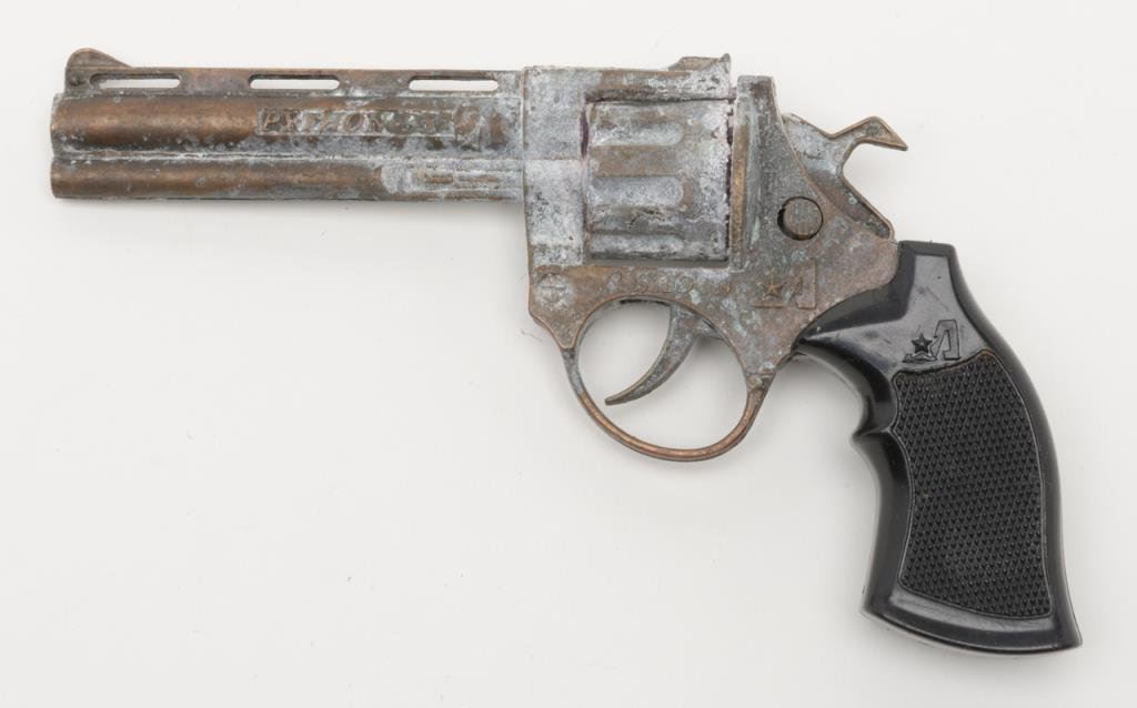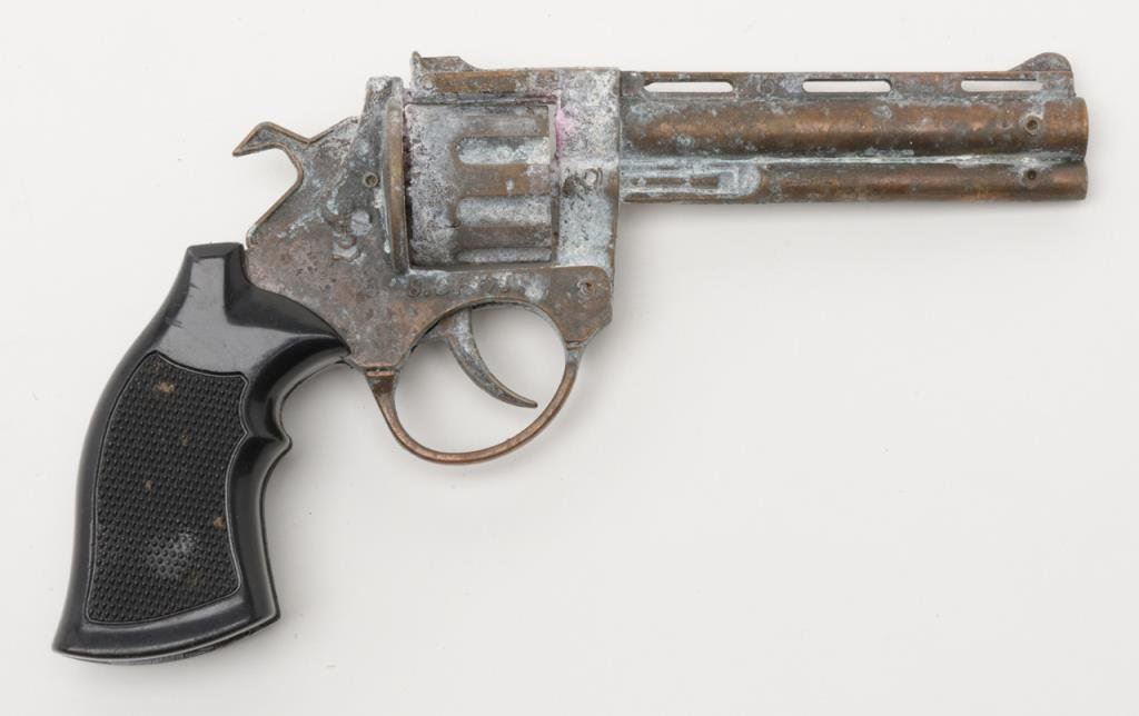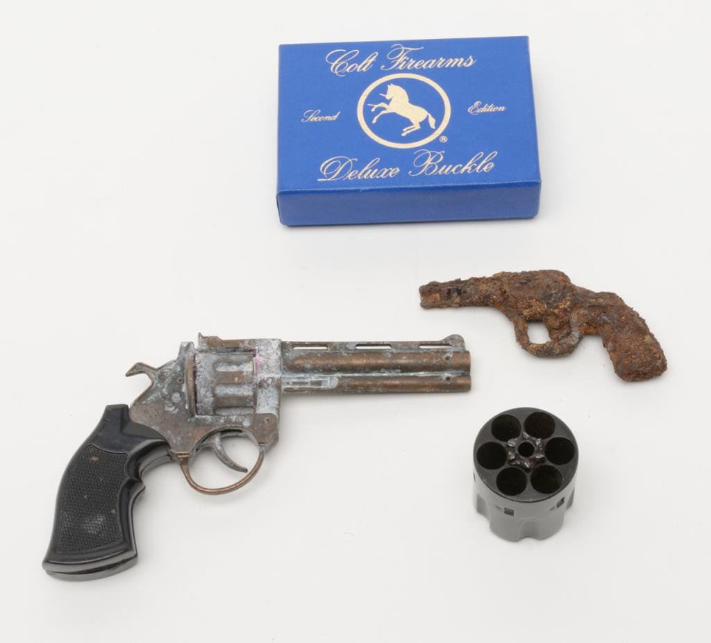 Bonanza lot including a cylinder for a single action revolver, a mini-Python cap gun, a rusty relic cap gun, and a reproduction belt buckle. Est.: $50-$100.