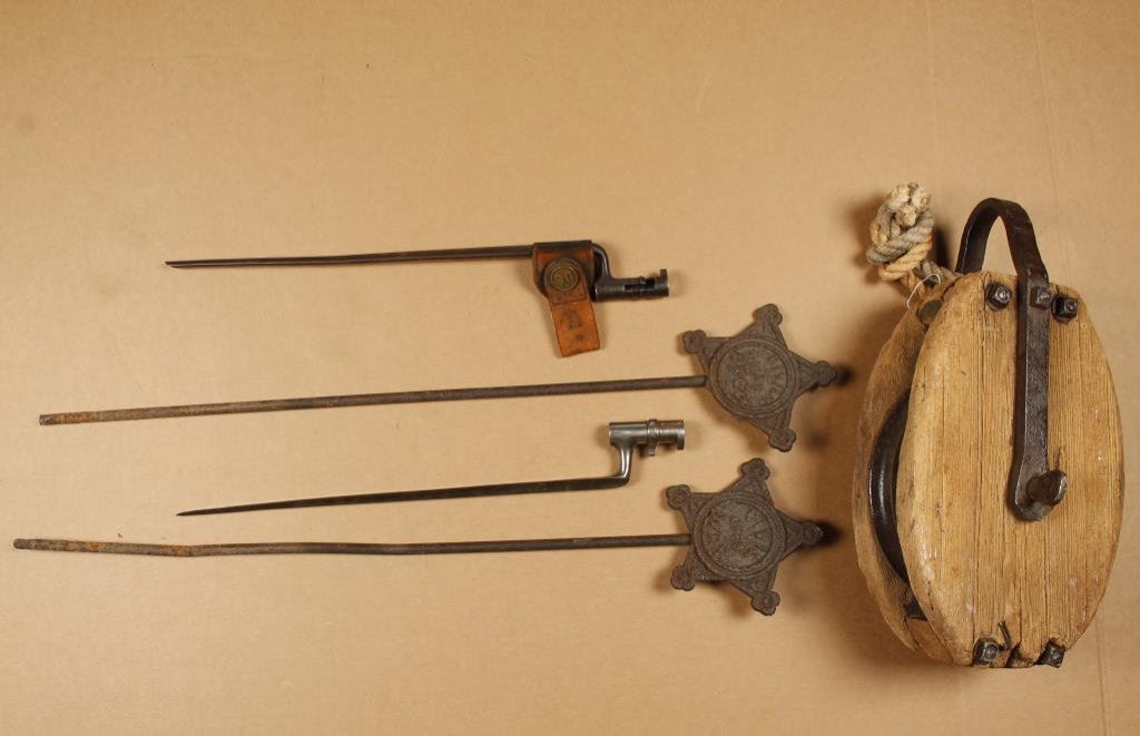Lot of collectibles including a large iron and wood block & tackle, approximately 19” overall; 2 American Civil War GAR iron grave markers and 2 U.S. socket bayonets, one with a metal sheath and leather hanger. Est.: $200-$400.