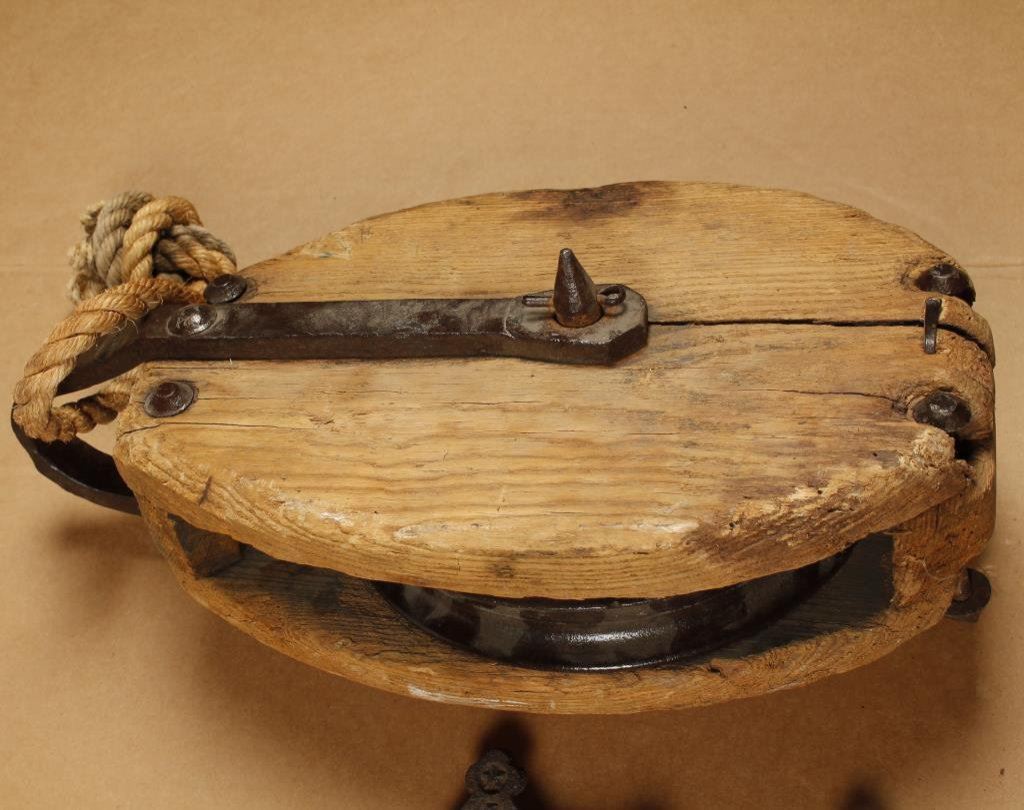 Lot 442 Lot of collectibles including a large iron and wood block & tackle, approx