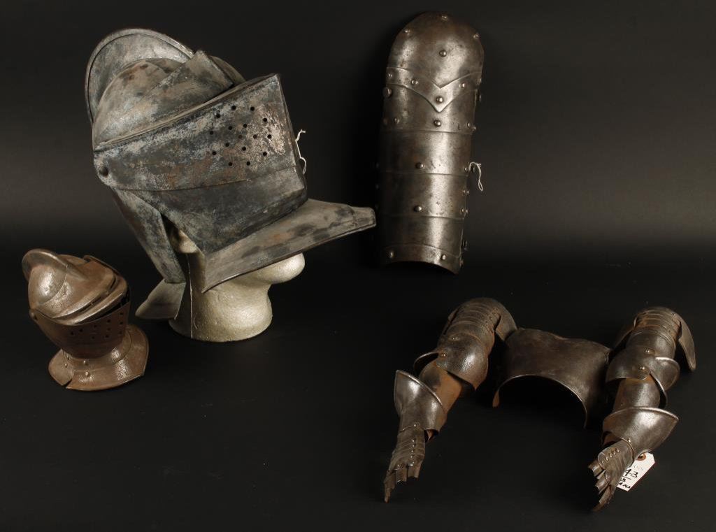 Lot of collector armor including a partial miniature armor set including the helmet/face shield, arms and back plate; helmet is approximately 7” in height, back plate 6” in height and shoulder/arm pieces 14” in length each; also a 16th to 18th century arm defense section approximately 14” overall and a 20th Century closed helmet with face guard. Est.: $300-$600.