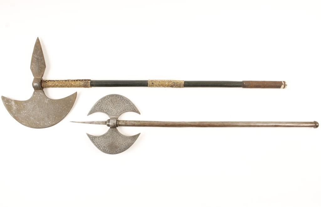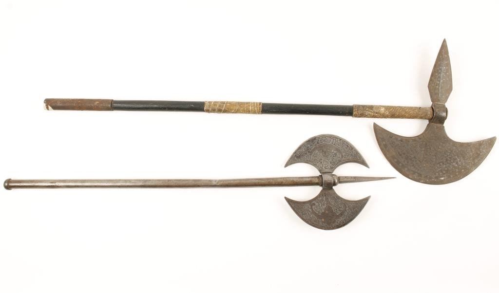 Lot of 2 battle axes including a hand forged axe with what appears to be snake skin wrap on a wood shaft ; axe is approximately 10” wide with front blade 8.5” in height, shaft is 26.5” long; head is decorated and shows a dark patina with some surface rust. The second axe is a double headed Indo-Persian piece, ca late 19th Century/early 10th Century, approximately 6” wide across the two etched heads and each is 5.5” in height; the metal shaft is approximately 22” long and topped with a 4”spike. Est.: $200-$400.