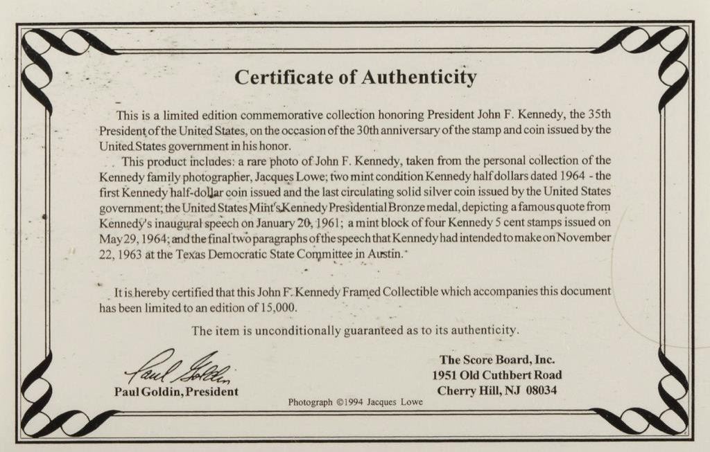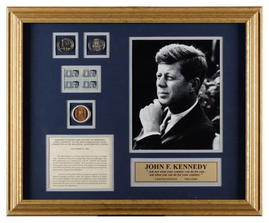 Beautifully framed and matted limited edition (9582/15000) memorial to President John F. Kennedy, approximately 19” x 23” overall and containing a photo of the President; 2 Kennedy half dollars, a block of 4 U.S. 1963 Postage Stamps of JFK, a commemorative coin of his 1961 Inauguration along with a Certificate of Authenticity and texts of his intended remarks to the Texas Democratic State Committee in the Municipal Auditorium in Austin and at the Trade Mart in Dallas. Est.: $100-$300.