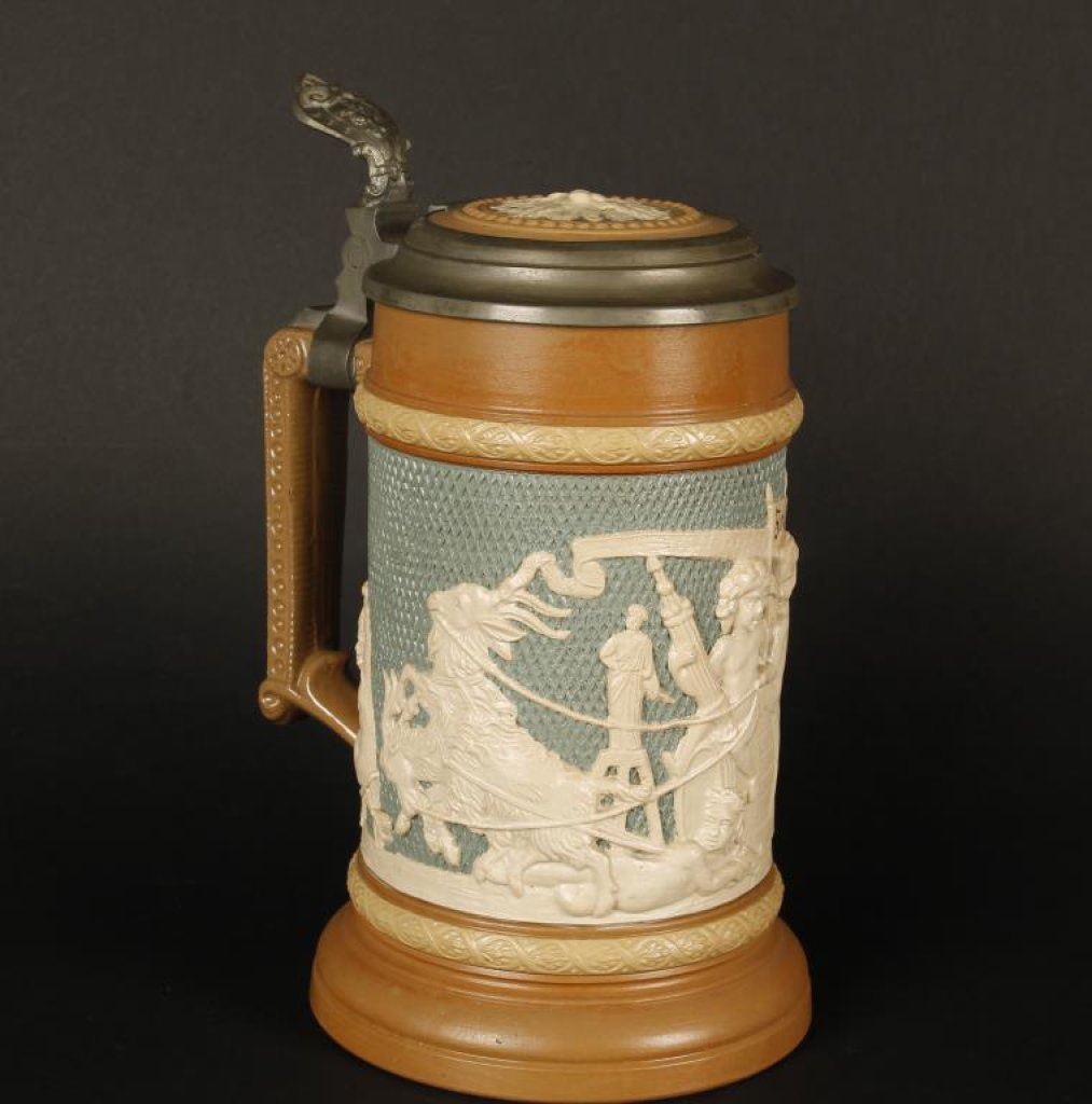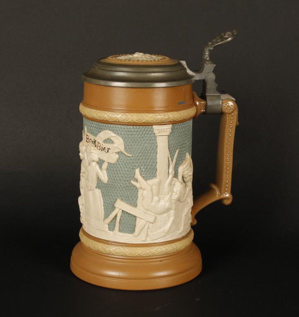 Metlach stein, #783, half Liter relief stein (Bock Beer); inlaid lid. Est.: $100-$200.