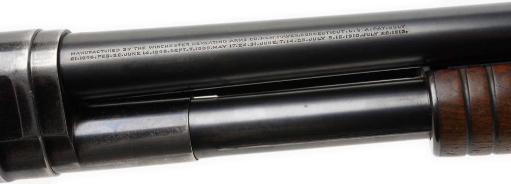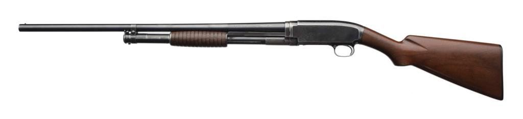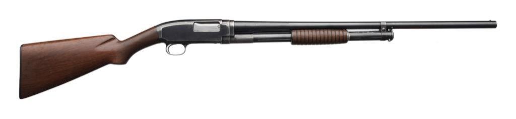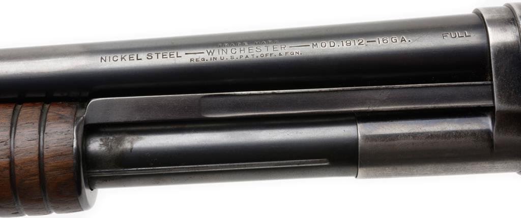 ++Winchester Model 1912 takedown semi-automatic shotgun, 16 gauge, full choke, 26” barrel, S/N 97754 (ca 1915), blued finish, wood butt stock and forend. This shotgun is in overall very good to fine condition displaying the majority of its original finish, matching barrel, crisp action, sharp markings, fine bore and very good to fine wood. Est.: $300-$600.
