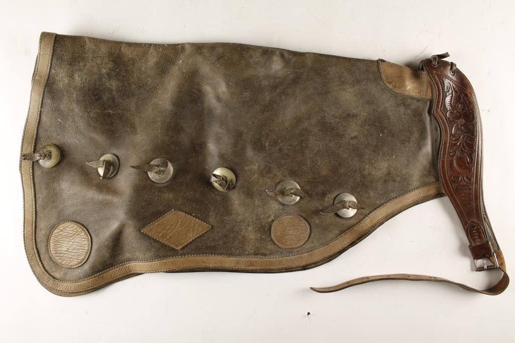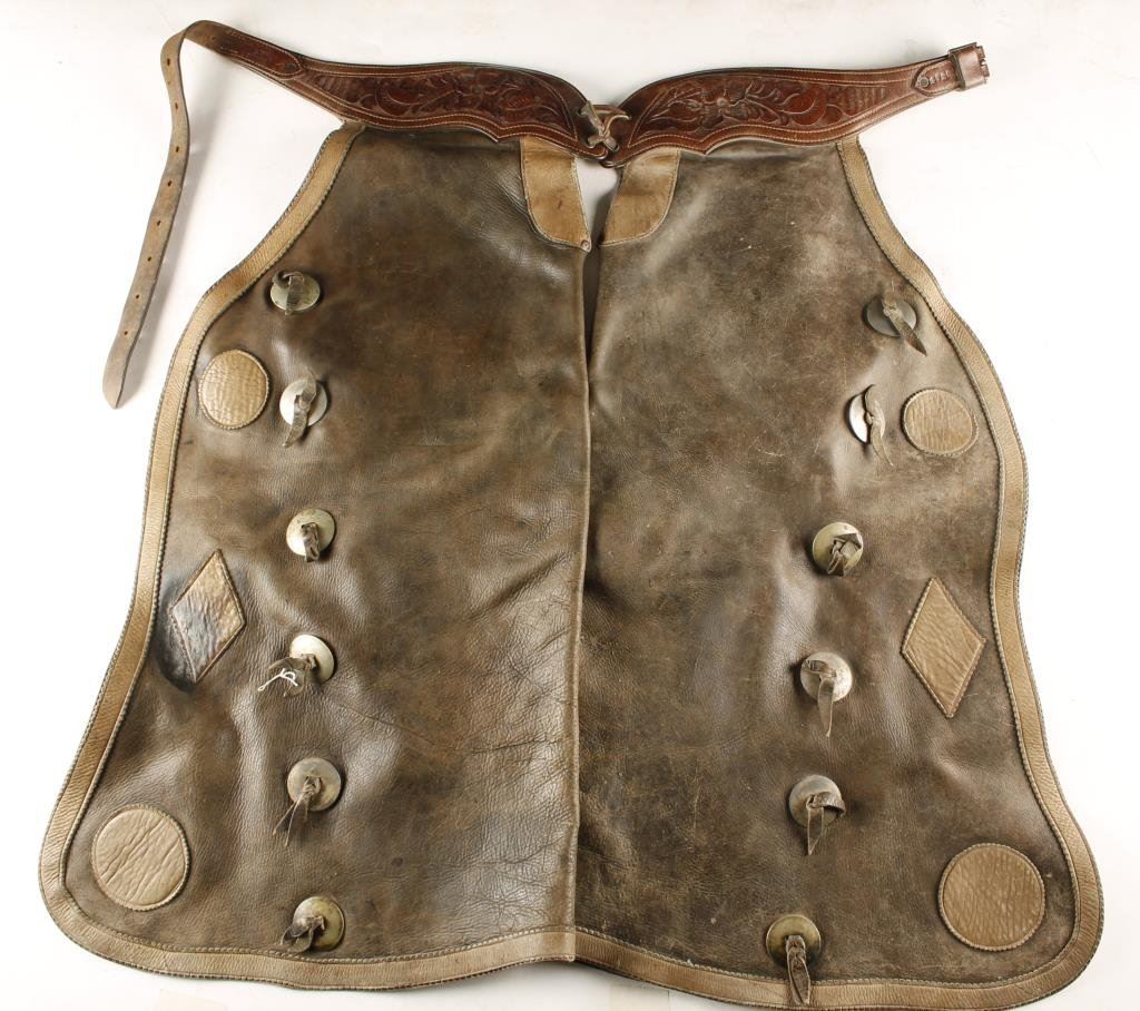 Lot 455 Pair of working cowboy’s heavy duty chaps with tooled leather belt marked