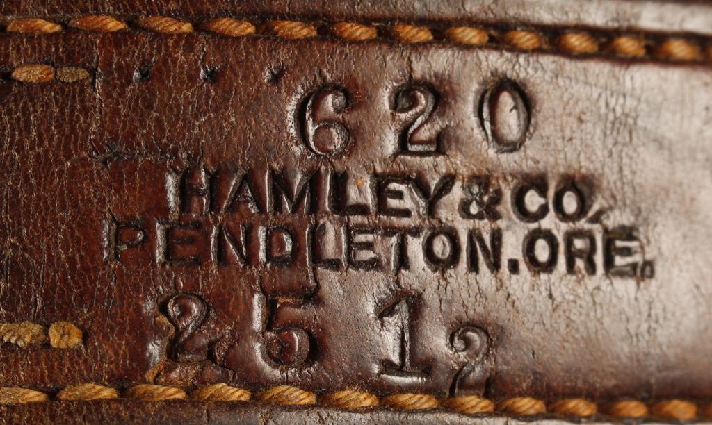 Pair of working cowboy’s heavy duty chaps with tooled leather belt marked “HAMELY & CO./PENDLETON.ORE.”; overall good condition. Est.: $150-$300.