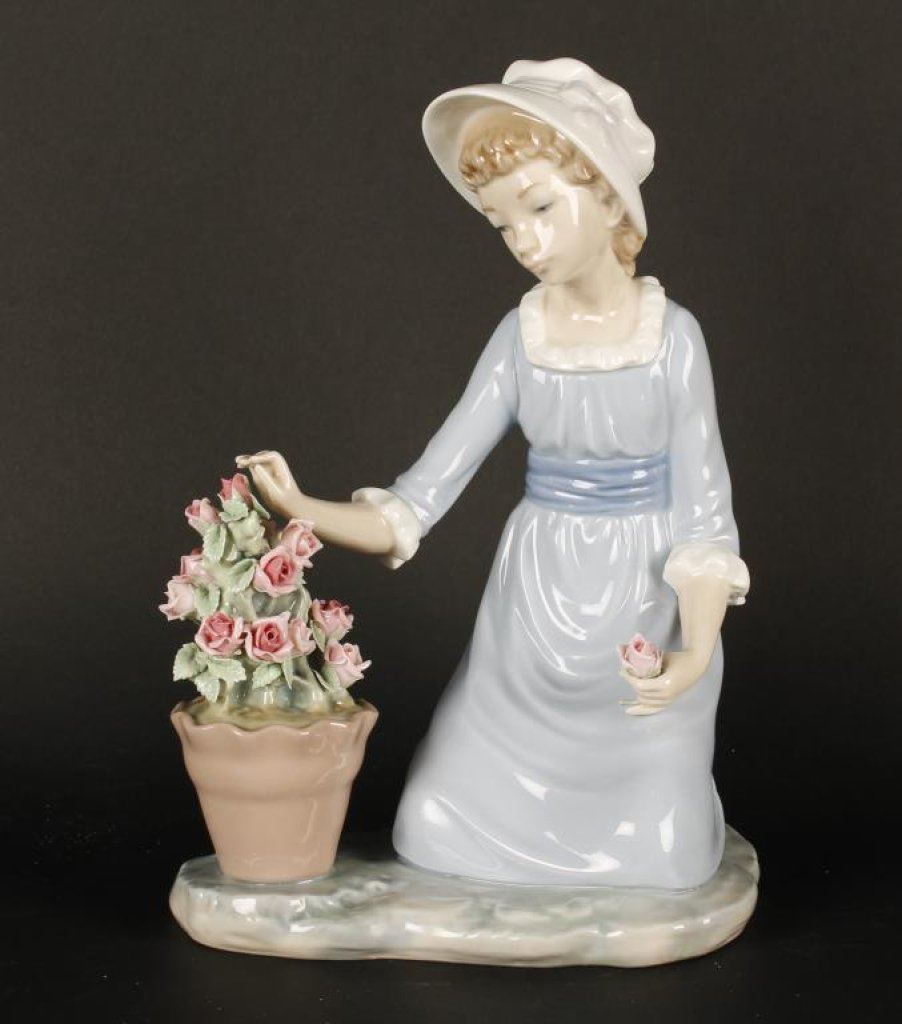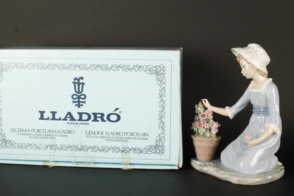 Lladro figure of little girls with flowers, approximately 8” in height and in fine condition at time of description; entitled “Flores a la Maceta”; with factory cardboard box. Est.: $100-$200.