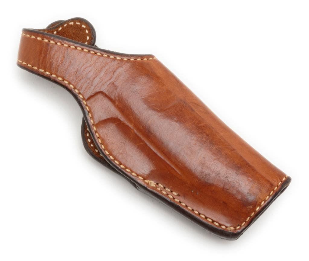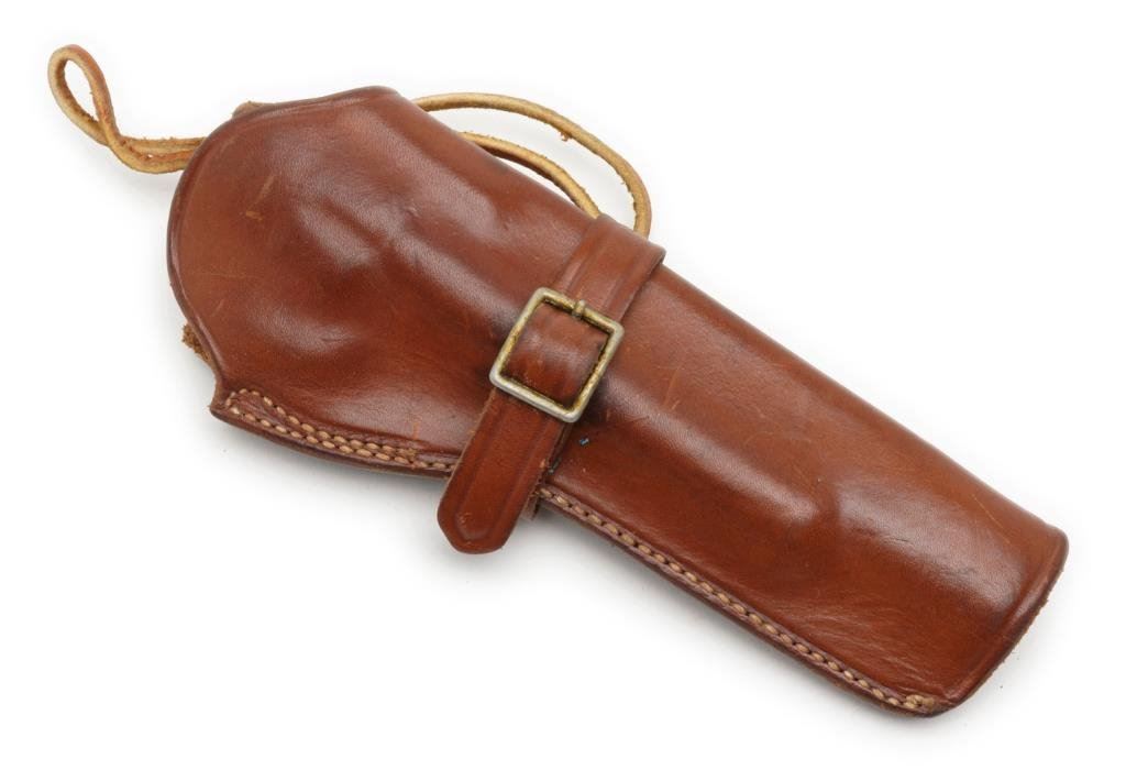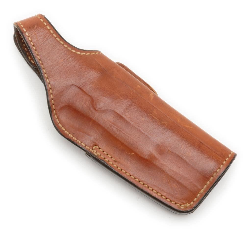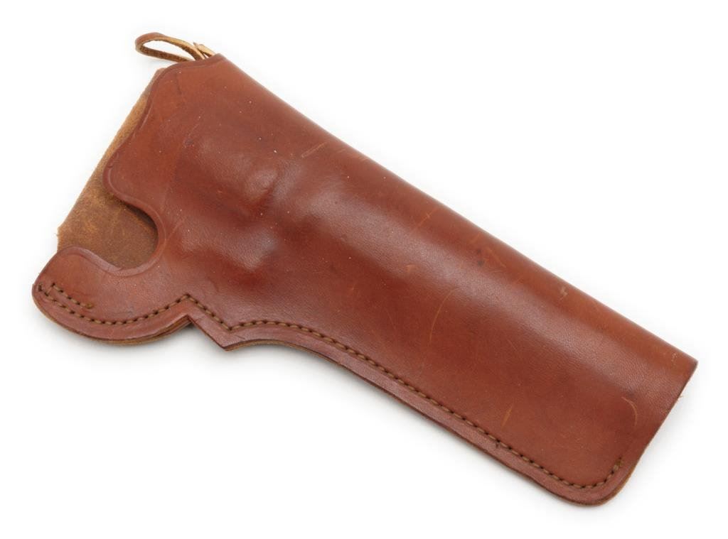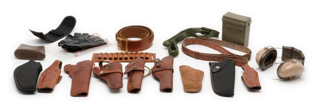 Lot of 9 misc. leather and nylon holsters for revolvers and semi-auto pistols by makers Bianchi, Safariland, Hunter, Lawrence, etc. Also a Hunter cartridge belt, leather sling, a pair of shooting gloves, ear protectors, etc. Est.: $150-$300.