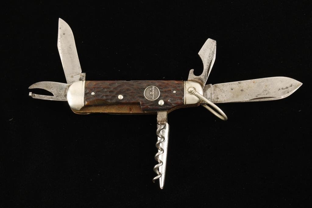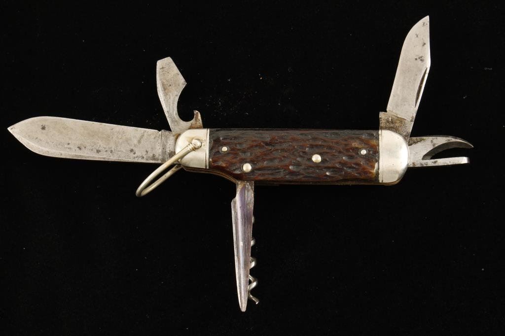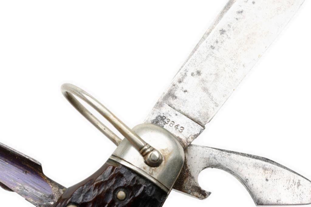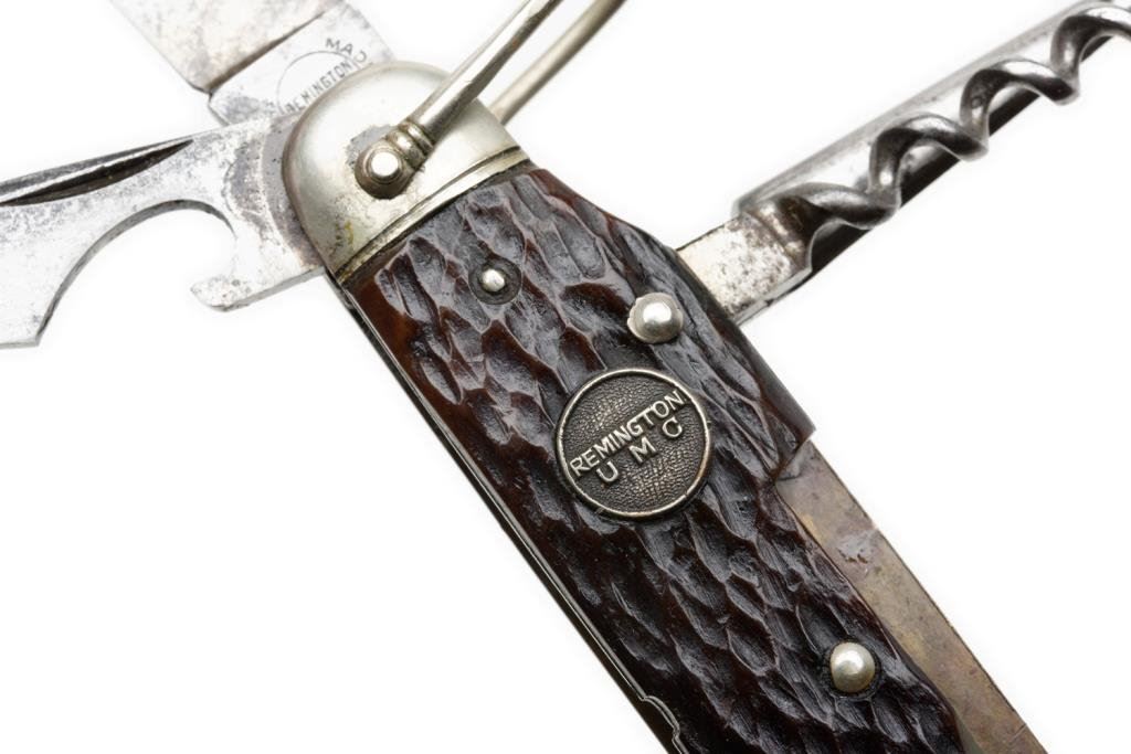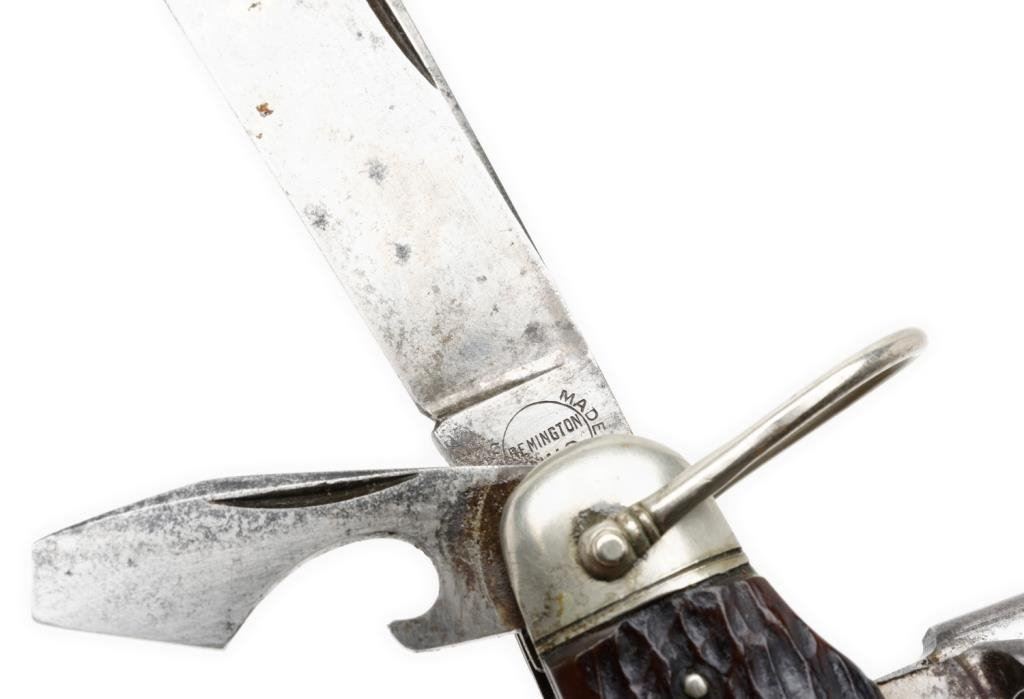Remington-UMC multi-tool pocket knife, approximately 3.5” overall closed with stag scales. This knife has two blades and four tools and is in overall very good condition showing some scattered spots of erosion and the number “P 3843” at the base of the larger blade. Est.: $175-$350.