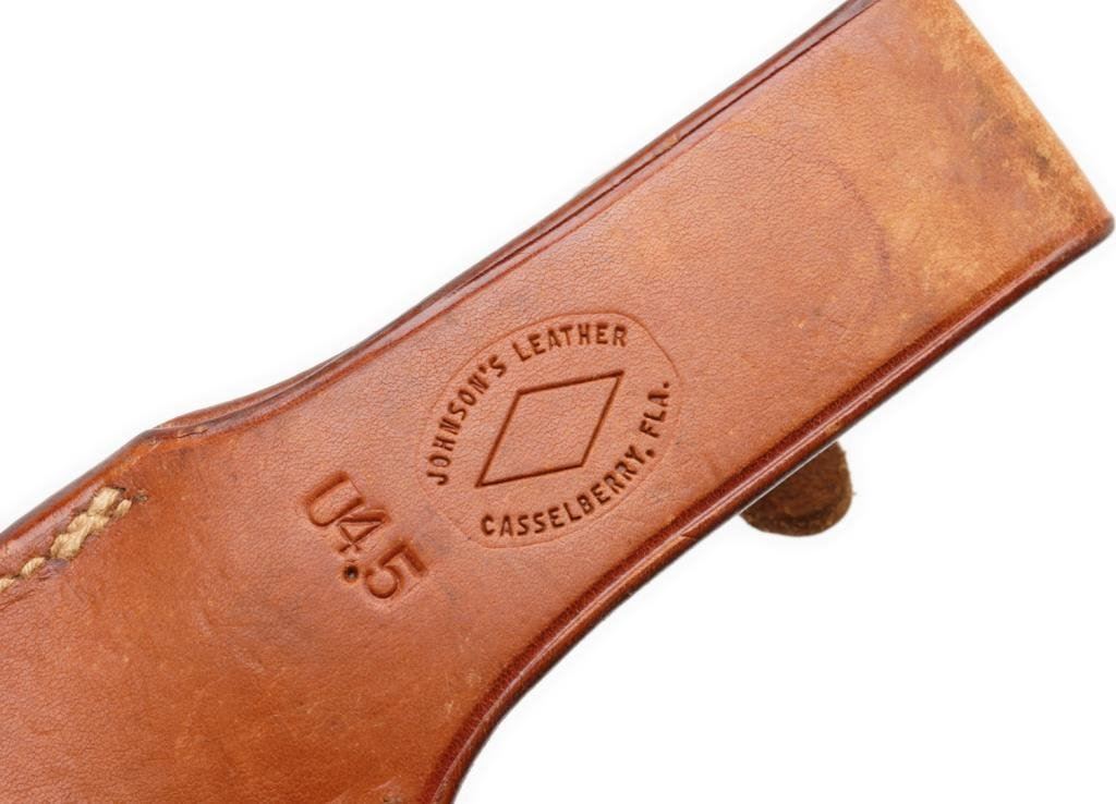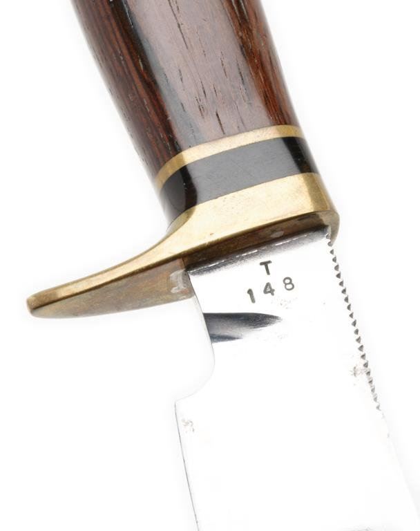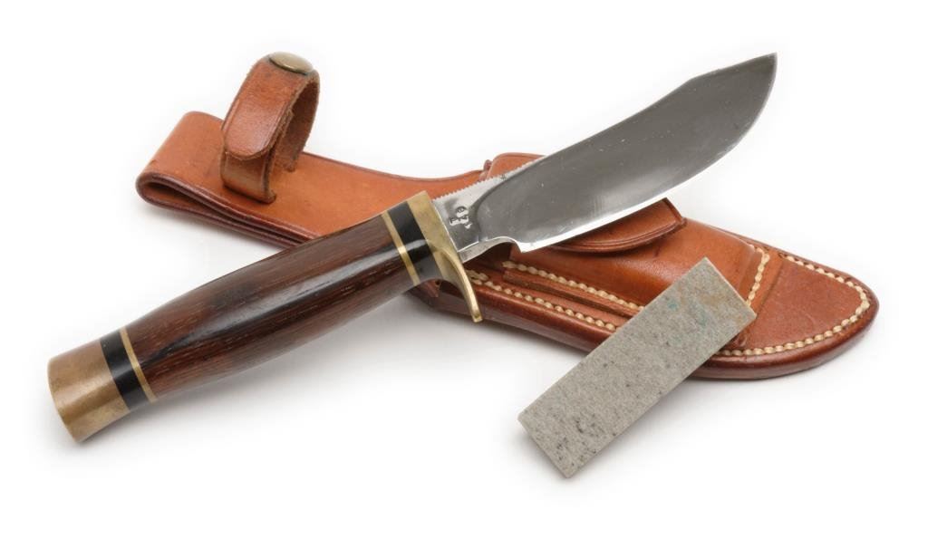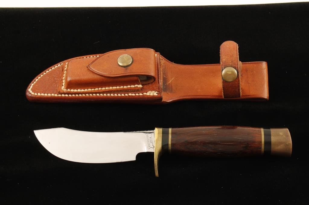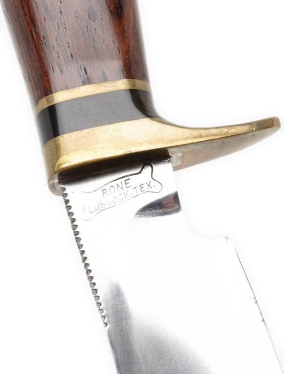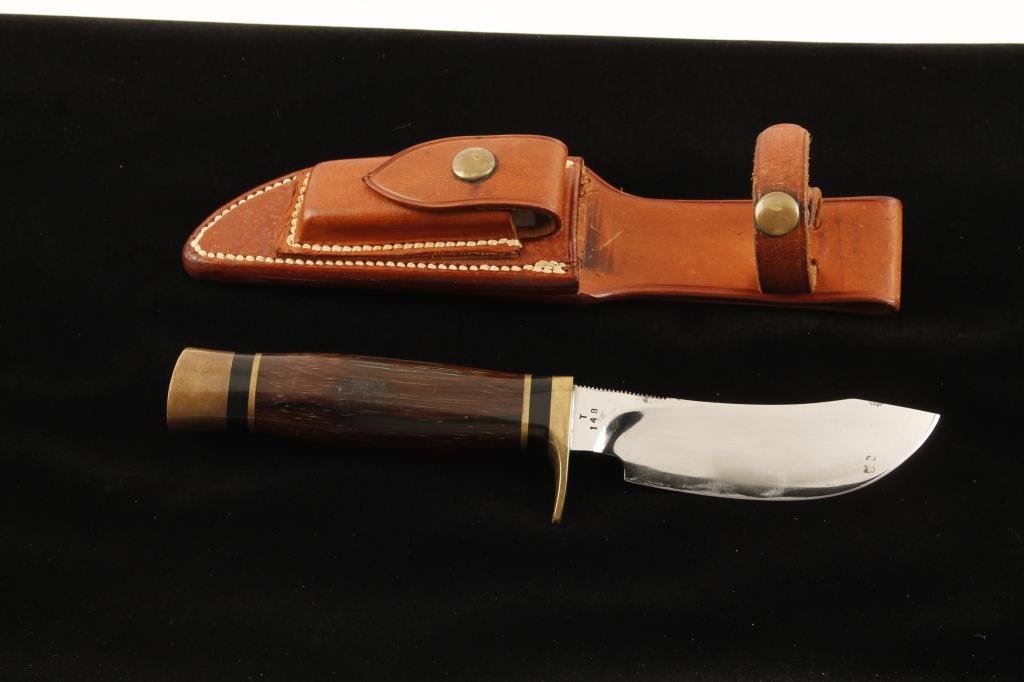 Custom skinning knife with leather sheath and sharpening stone, approximately 9” overall with a 4.5” blade marked “BONE/LUBBOCK, TEX.” and “T 148”; sheath is marked Johnson’s Leather/Casselberry, Fla”; in overall very good to fine condition with sharpening to edge. Est.: $150-$300.