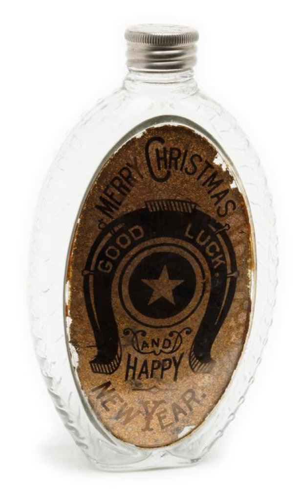 Glass flask with metal cap with gold reverse painted label: “Merry Christmas/Good Luck/Happy New Year” with Texas Star and harness; overall very good condition; ca turn-of-the 19th to 20th Century. Est.: $100-$200.