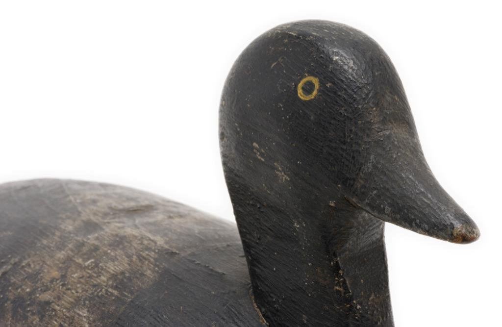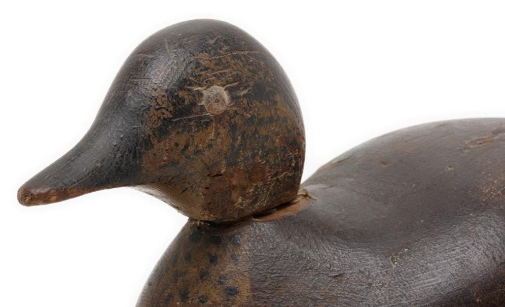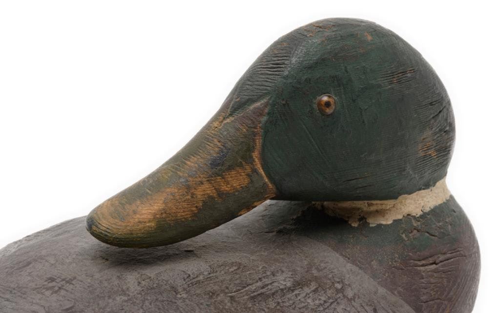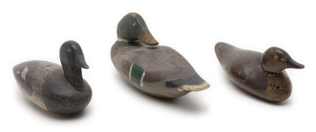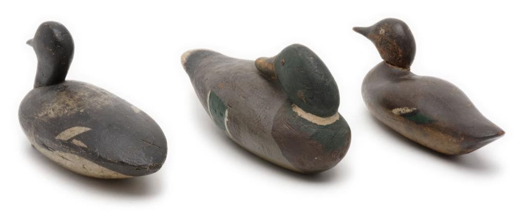 Lot of 3 carved and painted wooden duck decoys including one approx. 12” x 4-1/2” x 5” with considerable paint remaining that appears original; spotted breast with white, black and green side “feathers” in overall good condition; another approx. 10-1/2” x 5” x 6-1/2”, also with considerable original appearing black and white paint and with lead strip weight on the underside, also in good condition and a third decoy with head facing backward displaying brown, grey, green and white original appearing paint, glass eyes (two different types) and approx. 13-1/2” x 5” x 6-1/2” in overall good condition. A nice grouping of old decoys. Est.: $150-$250.