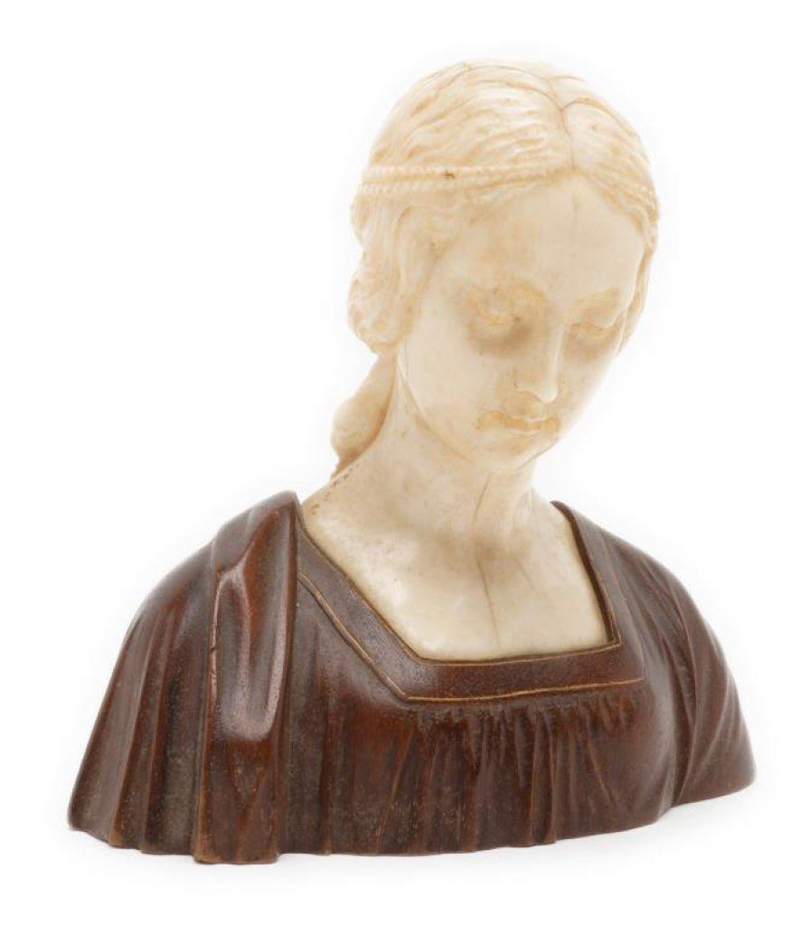 Old ivory and wood carving of medieval woman, approximately 4.5” in height, 5” wide and 3” deep in overall fine condition with a lovely patina. Est.: $150-$300.