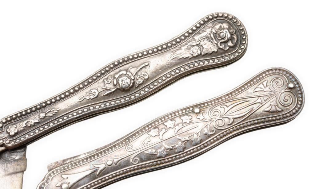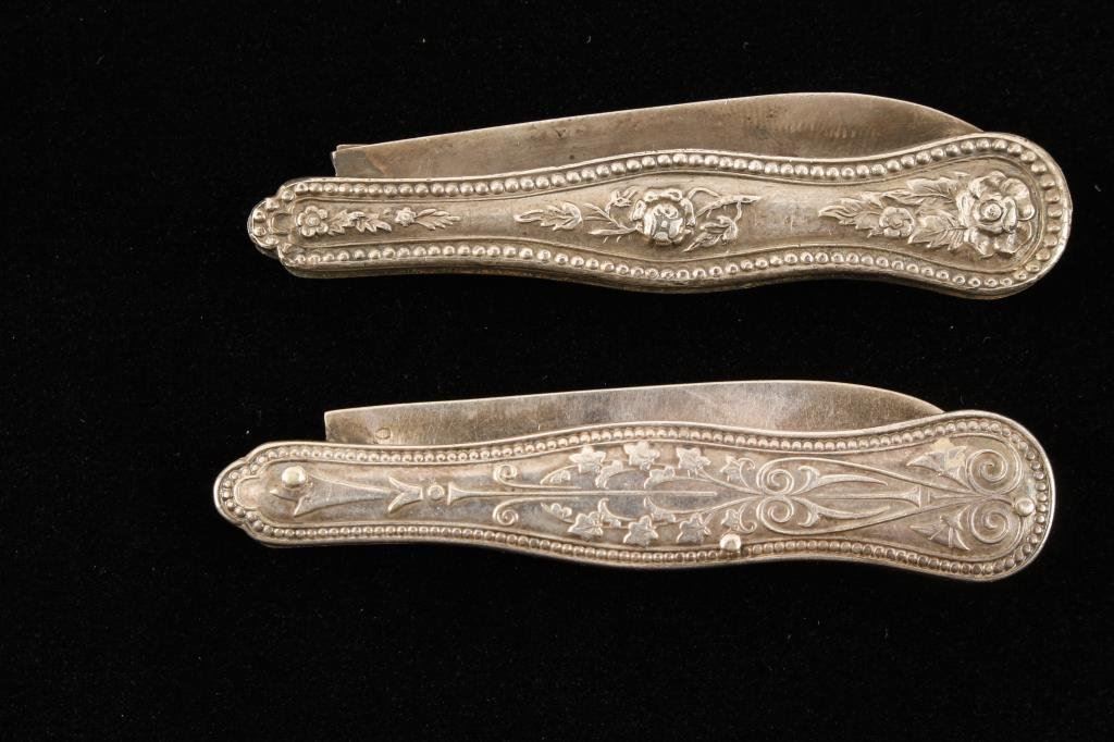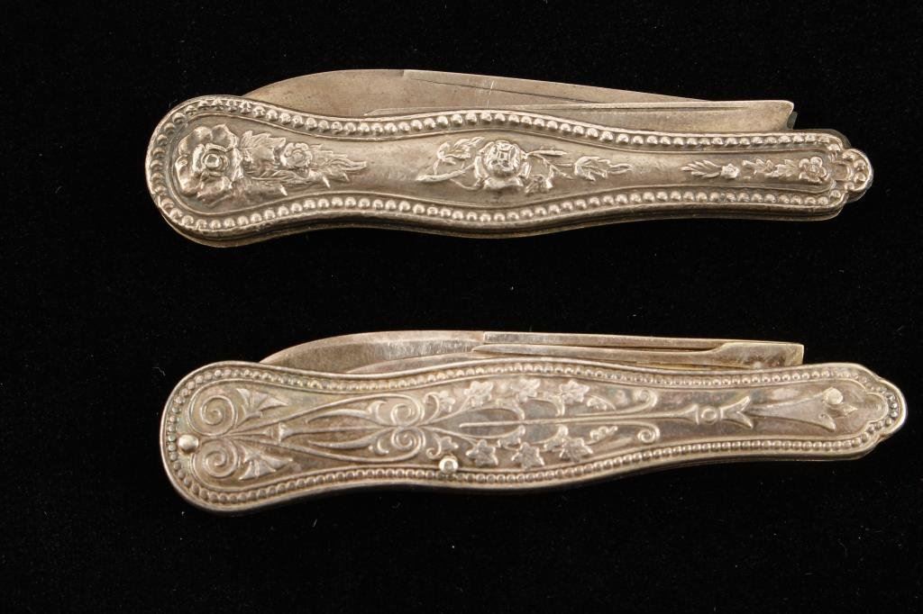 Lot 493 Elegant lot of 2 silver fancy embossed/relief folding double blade pocket