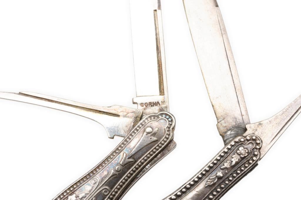 Elegant lot of 2 silver fancy embossed/relief folding double blade pocket fruit knives with silver blades, each approximately 3” overall closed; one is unmarked and in very good + condition; the other is in fine condition and marked “GORHAM”. Est.: $100-$300.