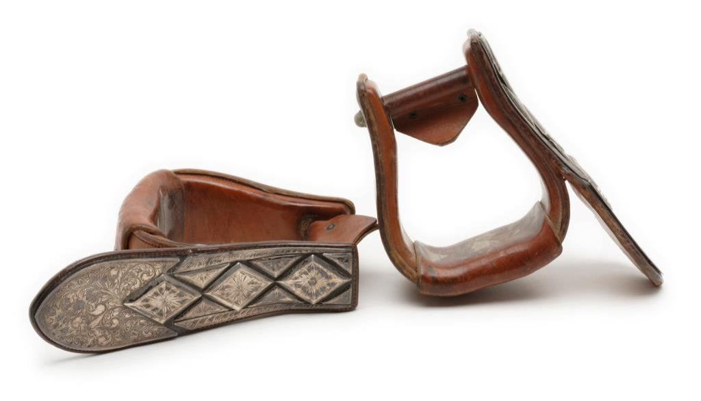 Fancy leather wrapped saddle stirrups with beautiful engraved silver exterior panels. Est.: $100-$150.