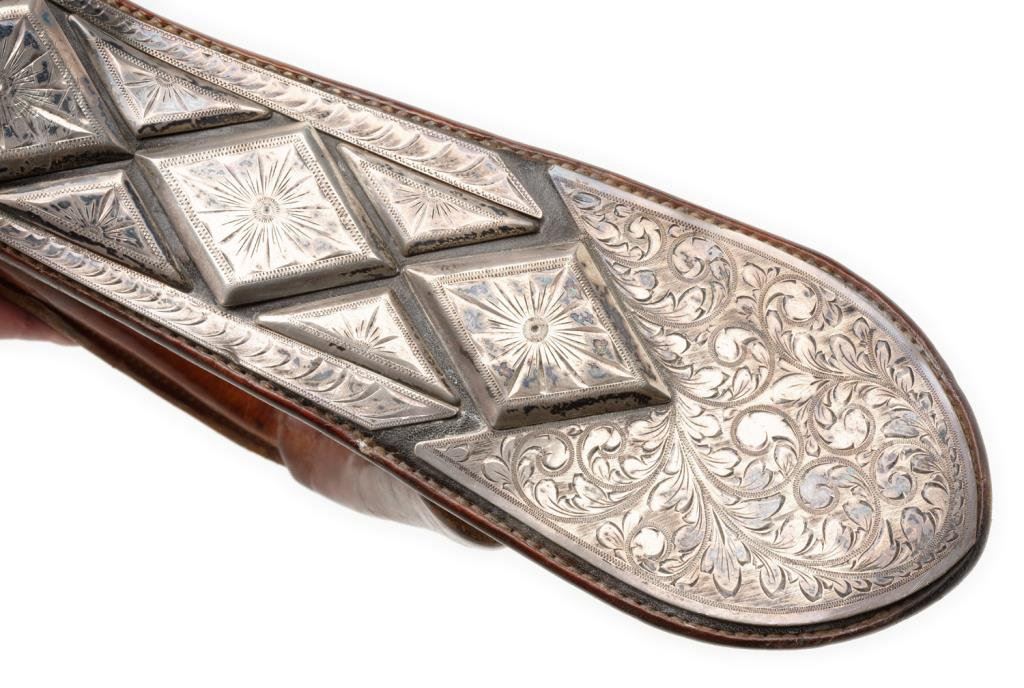 Lot 499 Fancy leather wrapped saddle stirrups with beautiful engraved silver exter