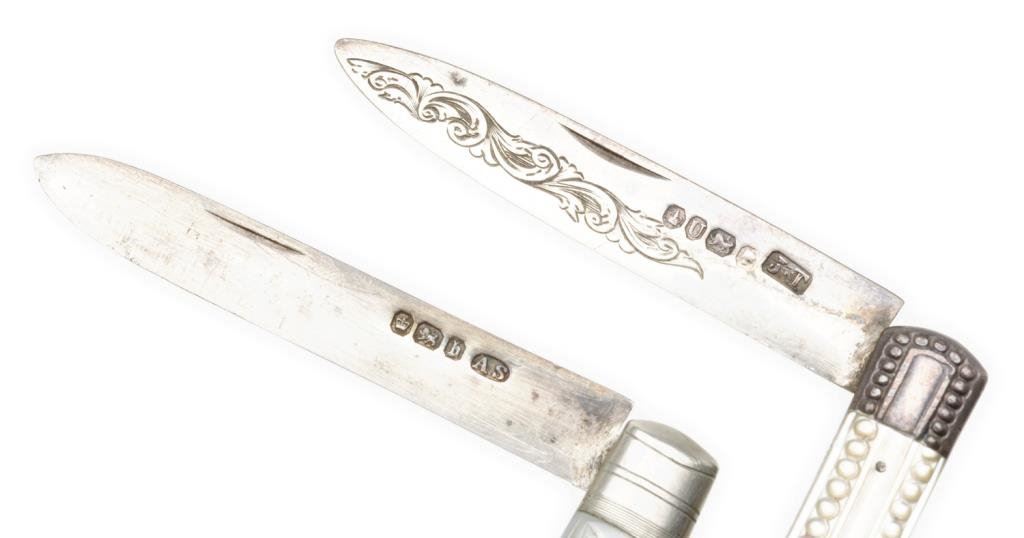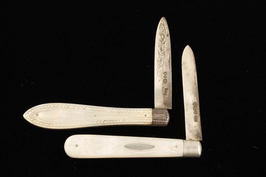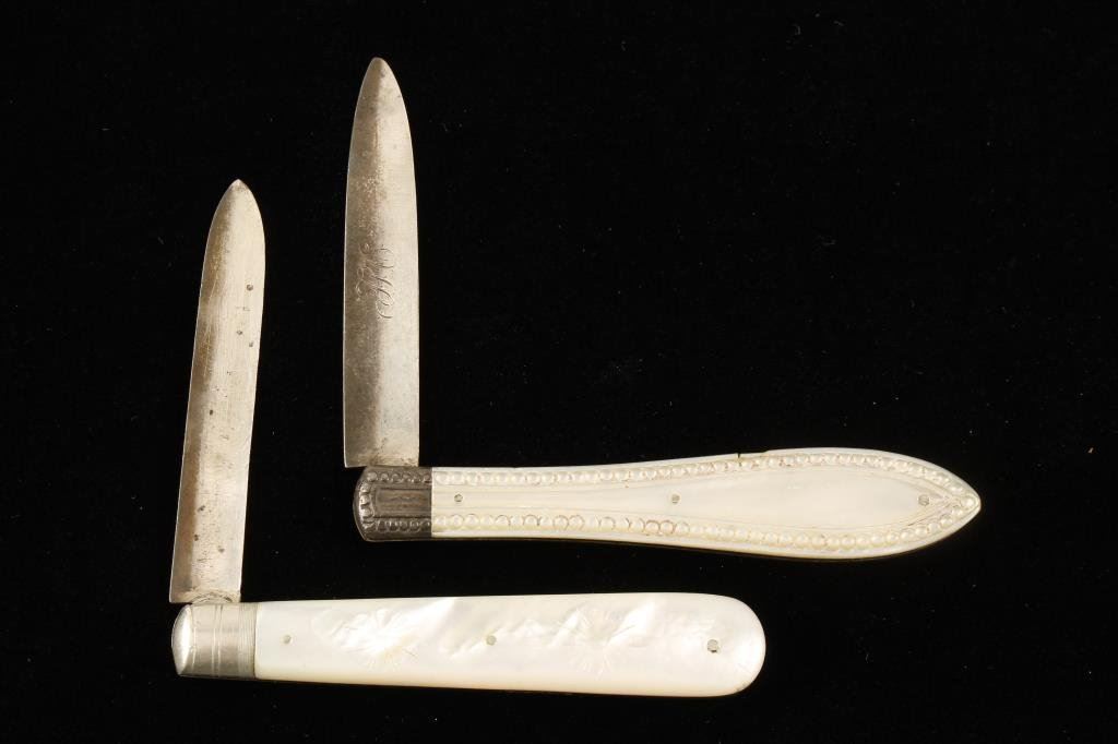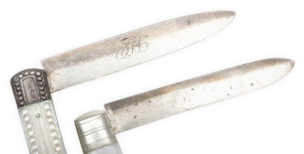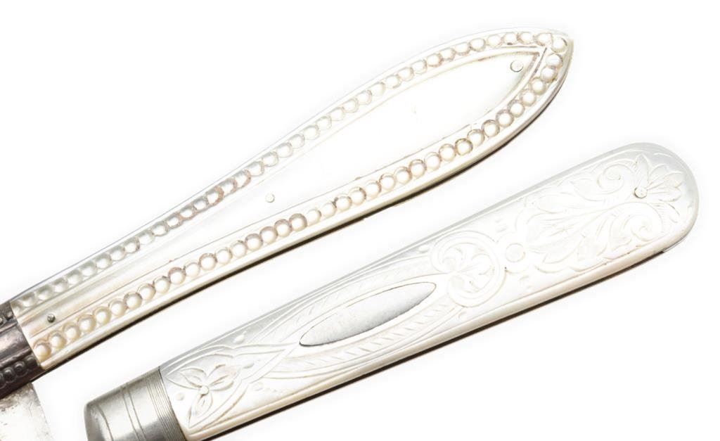 Lot of 2 beautiful silver hallmarked ladies fruit knives with mother of pearl carved slabs. One is approximately 3.5” overall closed with engraved and hallmarked blade with initials “TPC” in fancy script inscribed on one side of the blade; beautiful iridescent carved pearl slabs and in very good to fine condition. The second knife is approximately 3” overall closed with very fancy carved pearl slabs and a silver plaque on one side; this knife is in overall fine condition. Est.: $150-$300.