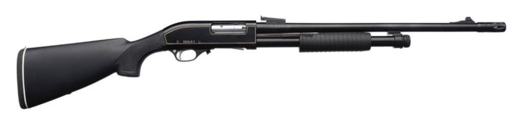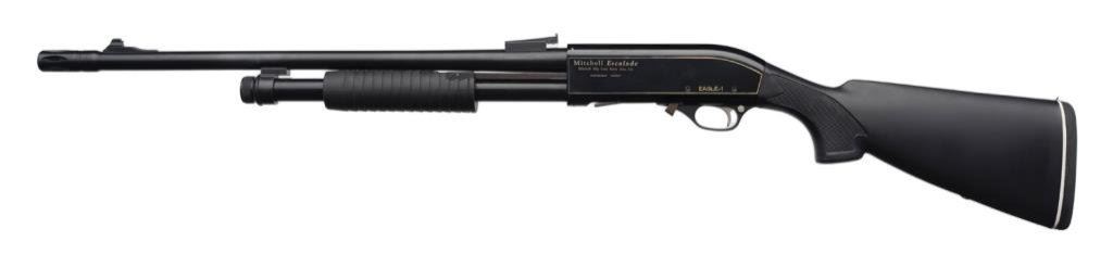 *Mitchell Escalade Model Eagle-1 pump action shotgun, 12 gauge, serial #38175. The shotgun is in overall very good condition with a 23” barrel with birdcage style muzzle break and rifle sights. The barrel and action retain nearly all of their black finish. The receiver is marked, “KARAELMAS, TURKEY.” The black synthetic s butt stock and fore end are in very good condition showing only minor handling marks. The buttstock ends with a rubber butt pad and 14 ¼” LOP. The bore is good, the action crisp and markings are sharp on this shotgun. Est.: $250-$400.