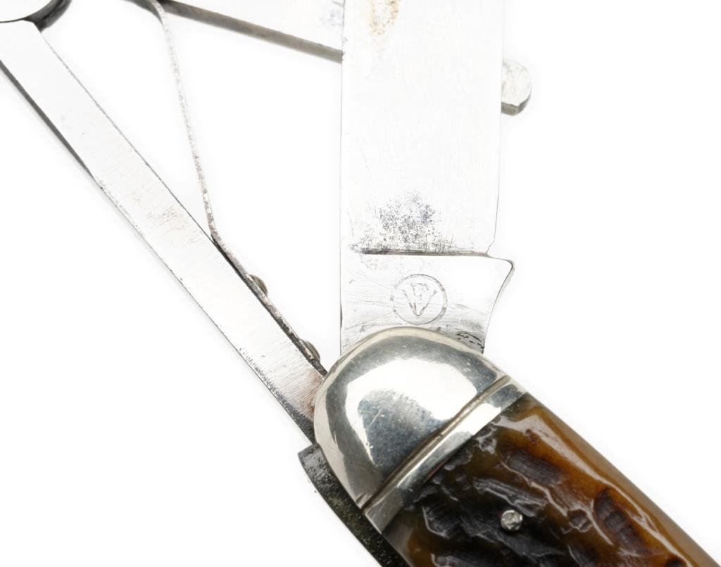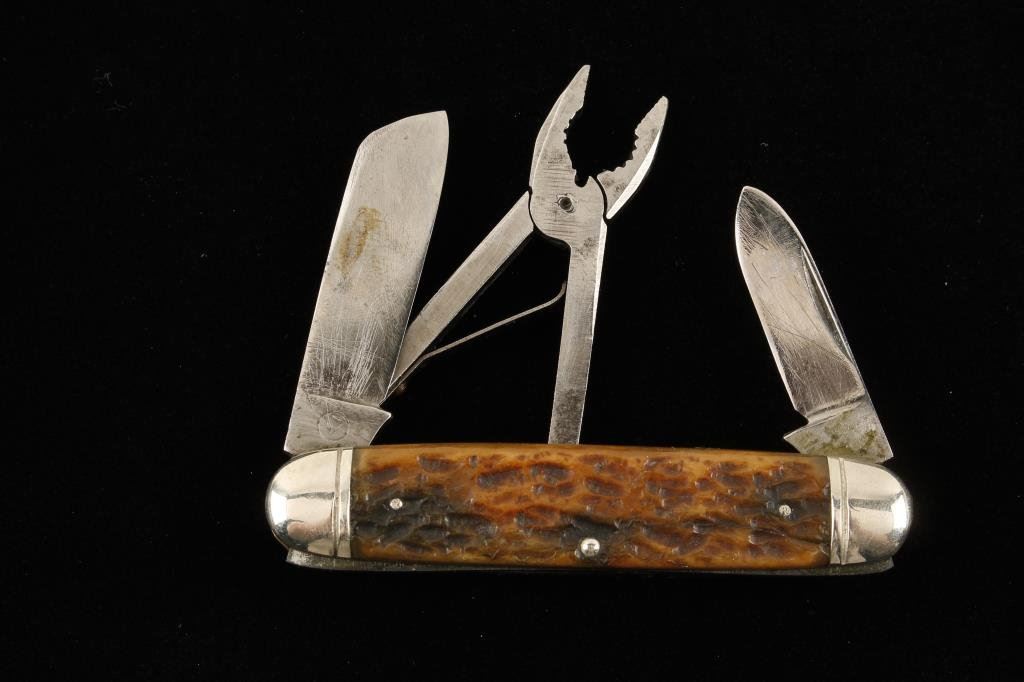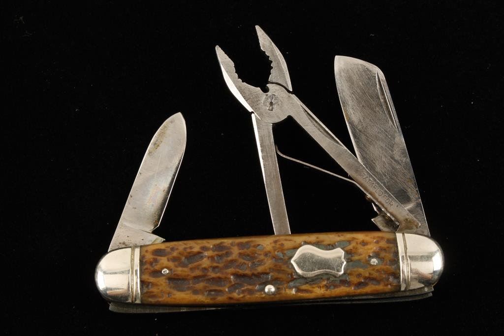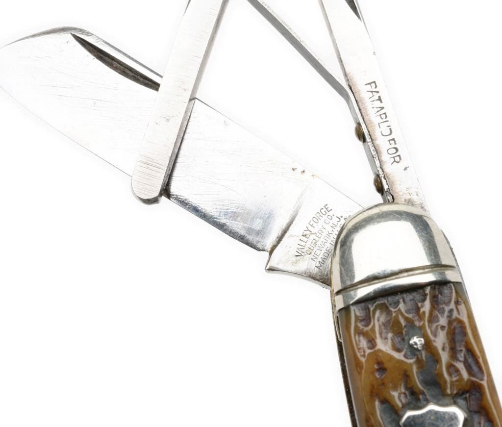 Valley Forge Cutlery Co. (Newark, NJ) multi-blade with tool pocket knife displaying stag slabs, approximately 3.75” overall closed and in very good condition. Est.: $100-$300.